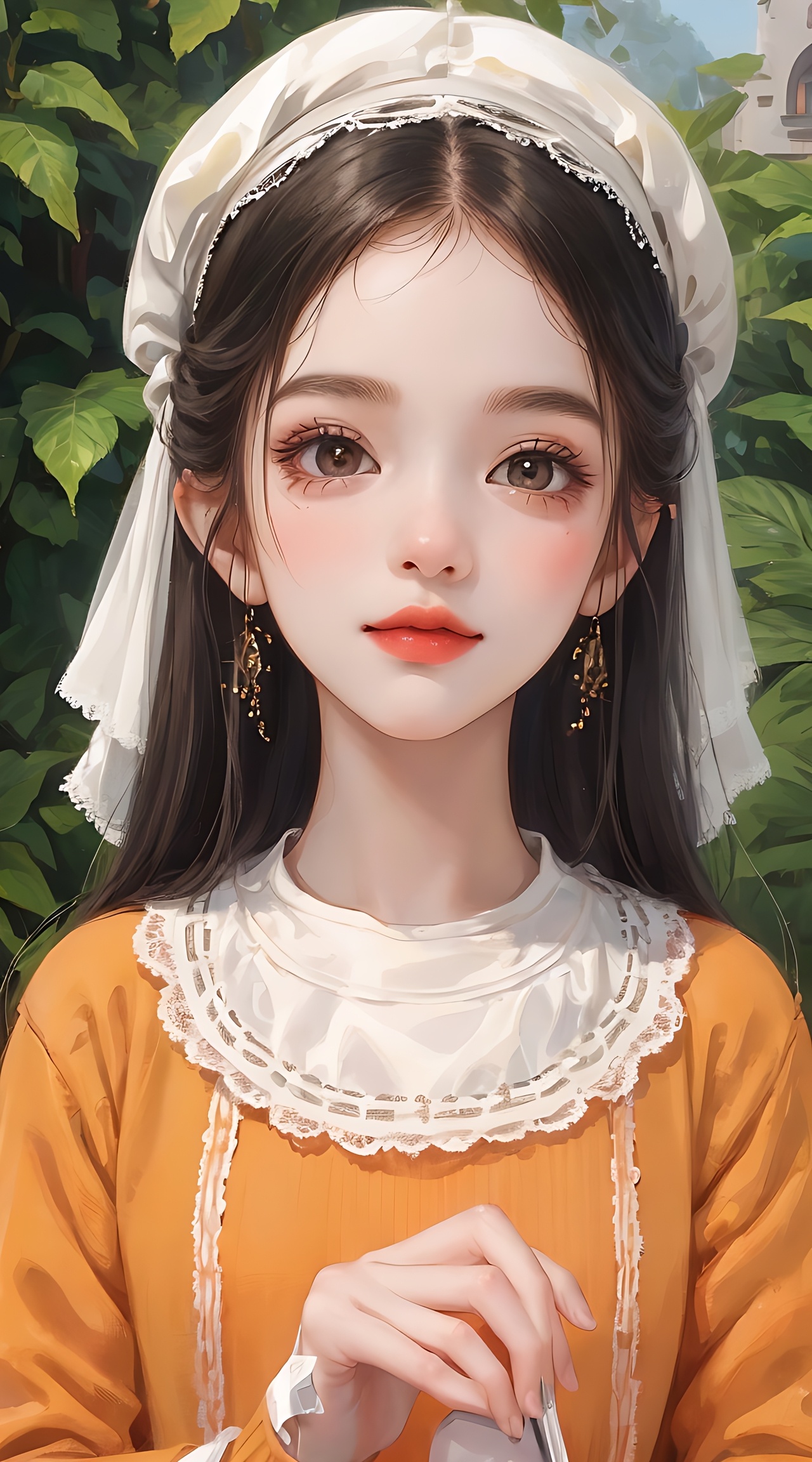一个漂亮可爱的小女孩,小萝莉,最高画质,精美画面,丁达尔效应,大眼睛,长睫毛,橘色毛衣裙,贝雷帽,完美五官,清晰脸庞,精致嘴唇,微笑,干净唯美的花园背景,温柔的光线,
