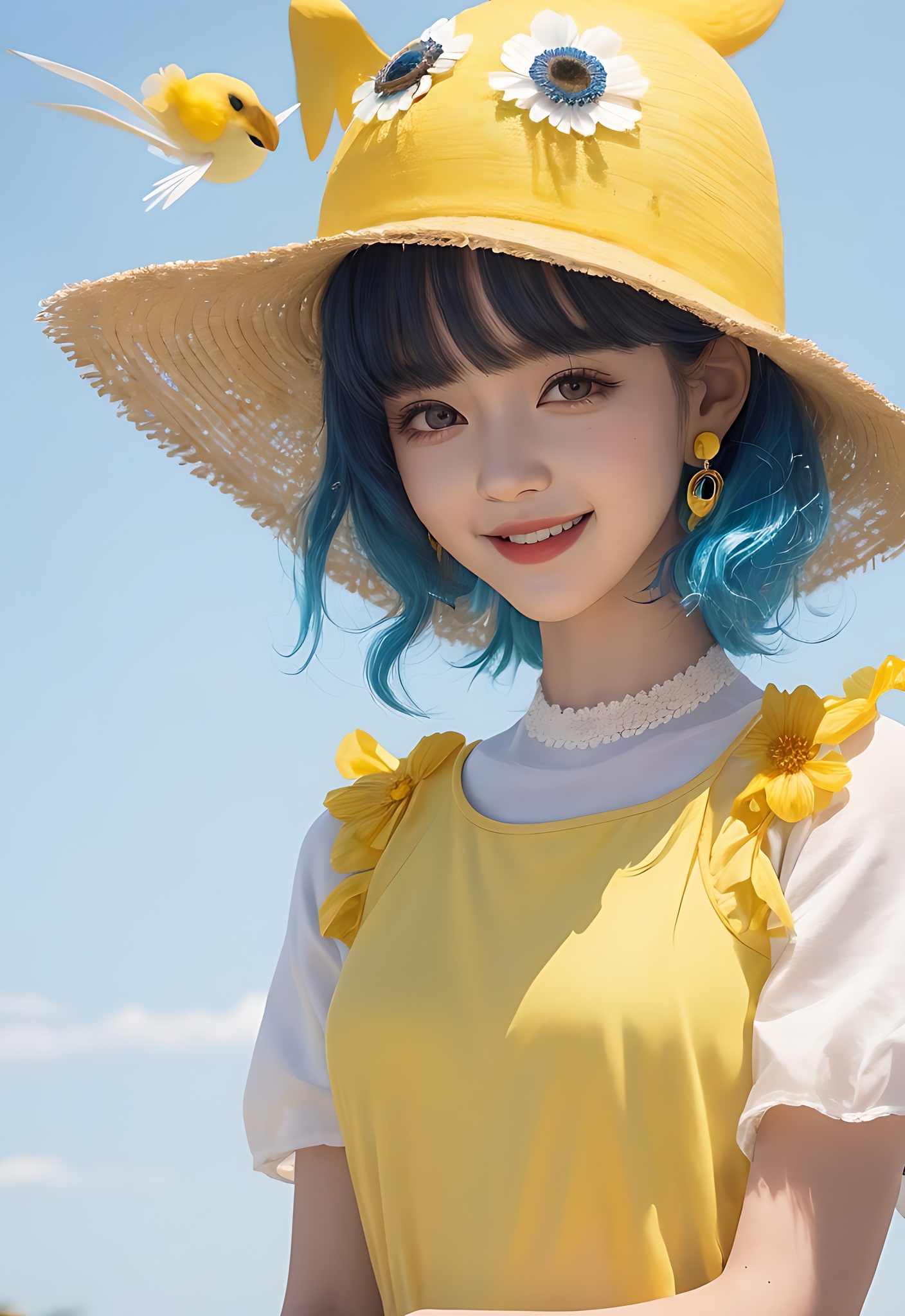 一个女孩,五官精致,瓜子脸,刘海,化妆,大眼睛,不露牙齿微笑,蓝色卷发(时尚),小黄鸭帽子,白色花耳环,锁骨,黄色短袖,白色背景,蓝色天空