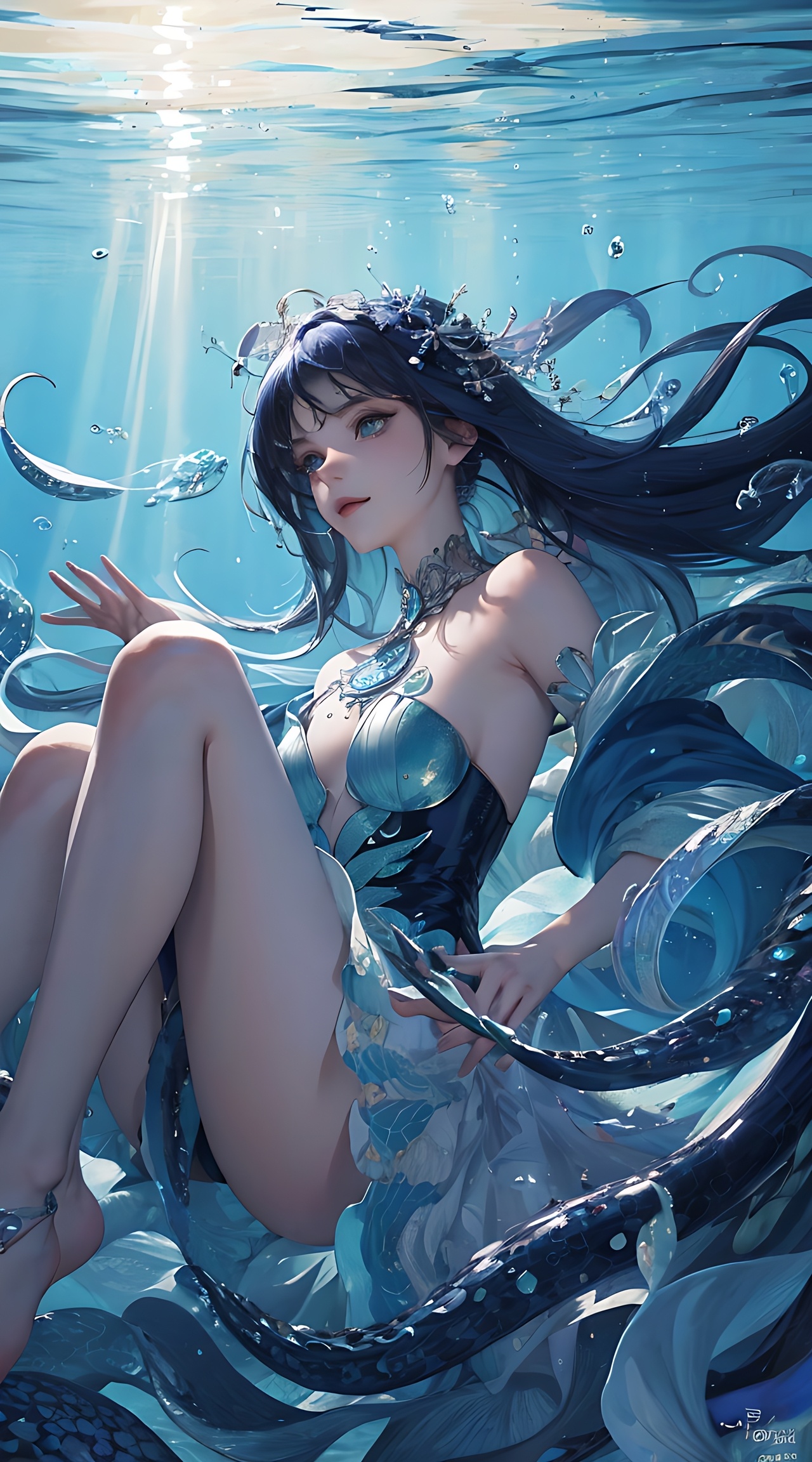 masterpiece,best quality,(illustration),extremely detailed CG unity 8k wallpaper,1girl,(solo:1.1),(beautiful detailed eyes),(shine eyes),(monster Girl:1.1),(glossy and flowing hair), (dark_blue hair:1.05),(gorgeous clothes),smile,stare,(dark_color Octopus legs:1.2),(clear_sky),(bubbles:1.05),cloud map plane,(underwater),Gorgeous ocean,(lacy),(posing sketch),(Brilliant light),cinematic lighting,(thick_coating),(glass tint),(Ambient light),long_focus,(Colorful blisters)(点击复制)