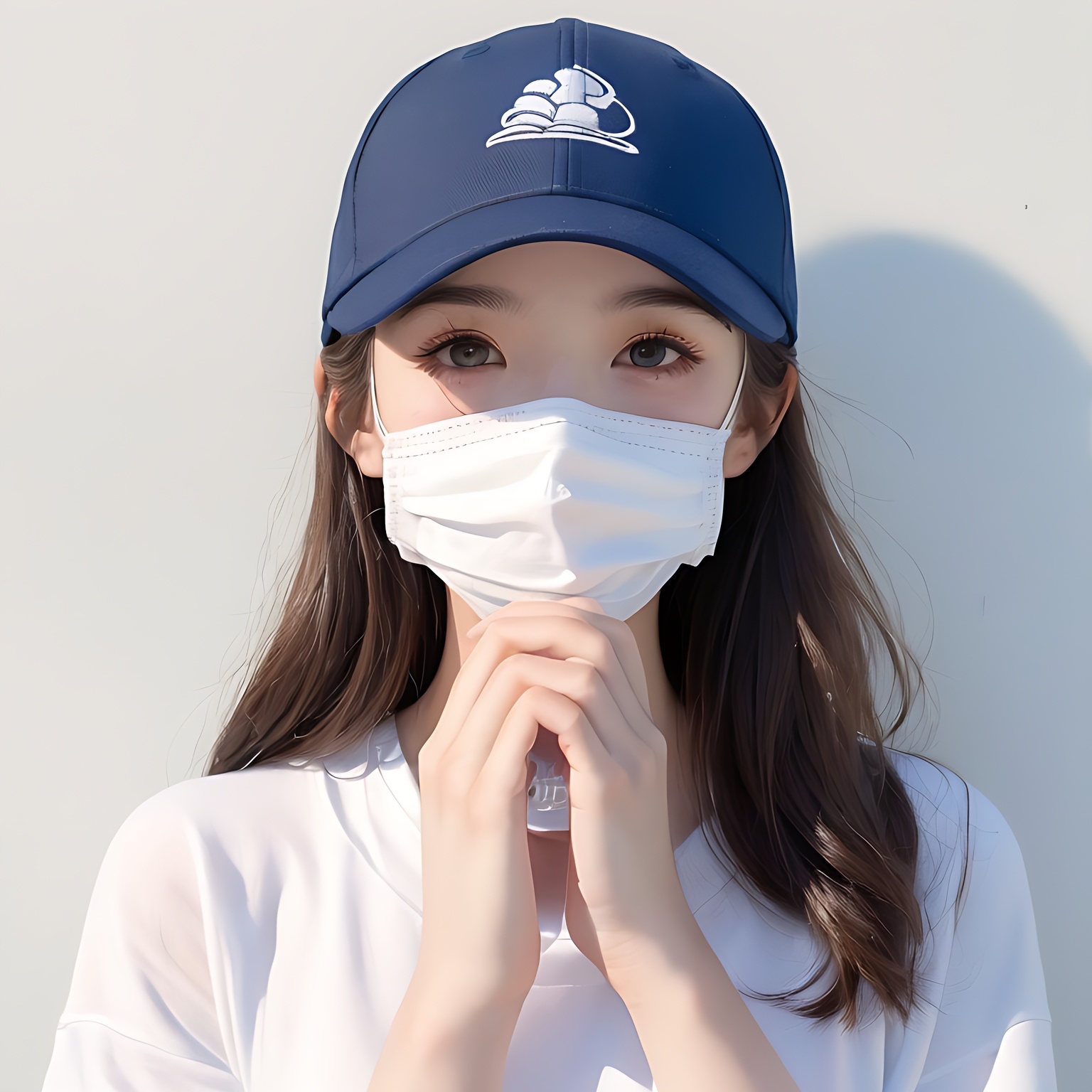 一个精致的女孩,文艺女孩,((用手遮住脸)),(戴着棒球帽),((看不见脸,遮住脸)),拿着手机,对着镜头拍照,遮住脸,上半身特写,超酷简单服装,纯色简约背景,极致光影