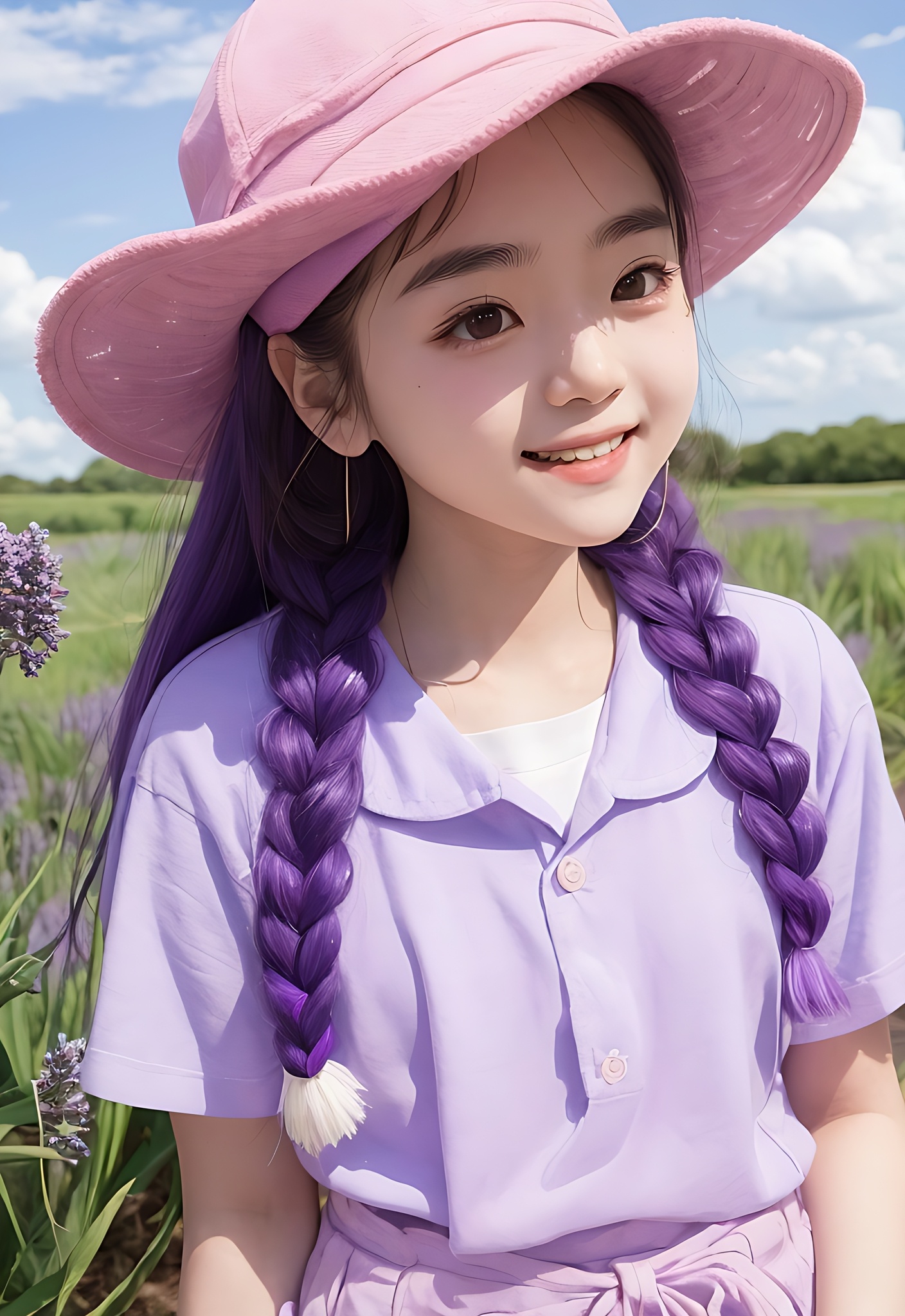 宫崎骏 1个女孩 戴粉色棒球帽,蓝天白云,,2个麻花辫,身后有薰衣草花海,开心的笑,大眼睛,紫色薰衣草衣服