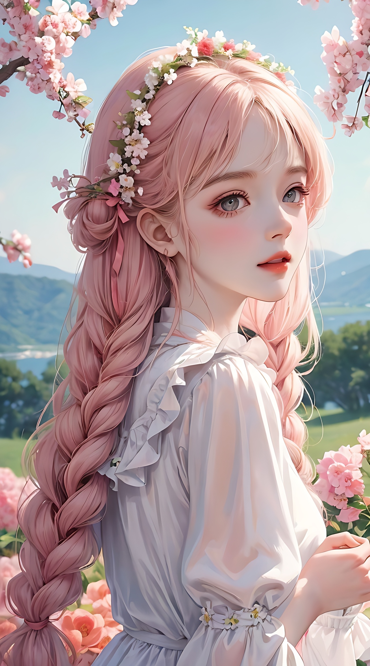 远处田野,美丽的少女开心地笑着,笑着很甜,幼嫩可爱,精致的五官,扎着两个淡黄色麻花辫,淡粉色连衣裙,盛开着淡红色的鲜花,女孩大眼睛,半身像,展示了农村的宁静,美景,梦幻,宫崎骏,8倍分辨率,景深,高清,v1