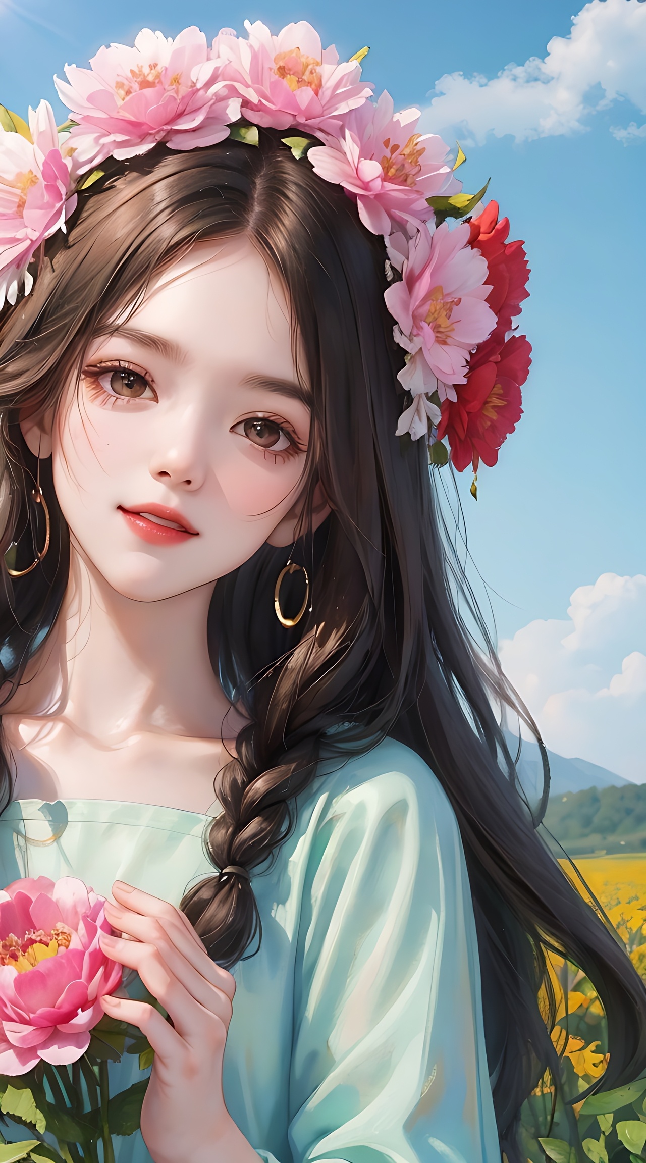 开心甜美少女,可爱,鹅蛋脸,年轻阳光,有锁骨,有刘海,正视我,面带微笑,手抚脸颊,穿大红色碎花裙,麻花辫,帽子有花环,油菜花花田,田埂,阳光通透,光影明显,精致的五官,高质量CG,8k分辨率,电影画质,氛围温暖,灿烂。甜美少女,可爱,瓜子脸,年轻阳光,黑棕色的长发,微卷,明亮的大眼睛,精致的鼻子,粉嘟嘟的嘴唇,美丽动人的微笑,红色碎花连衣裙,手捧着牡丹花,脸贴近牡丹花,正面,半身肖像,高质量CG,8K分辨率,超清晰,干净的背景(点击复制)