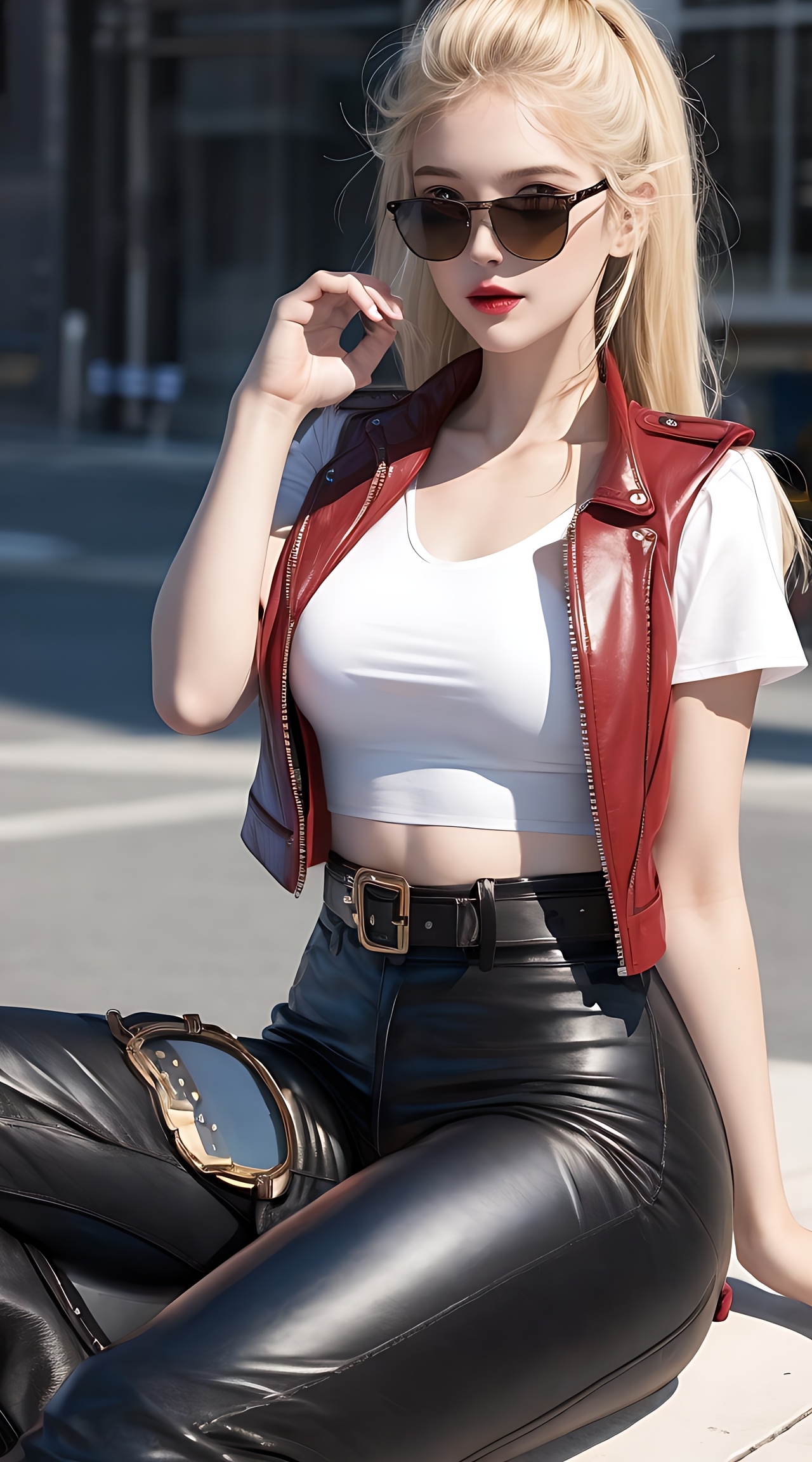 电影级光影质感,8k,超高画质,超真实光影效果,,红色皮上衣,,太阳镜,色彩爆炸,白色短袖,金发女子,甜美微笑,金色瞳孔,精致娃娃脸,脸部增强,,(立体感),((凸起)),(adidas文字),锁骨,马甲线,肚脐,肋骨,腋下,,白色皮带,皮裤,高筒靴,都市背景(虚焦)),不要手