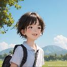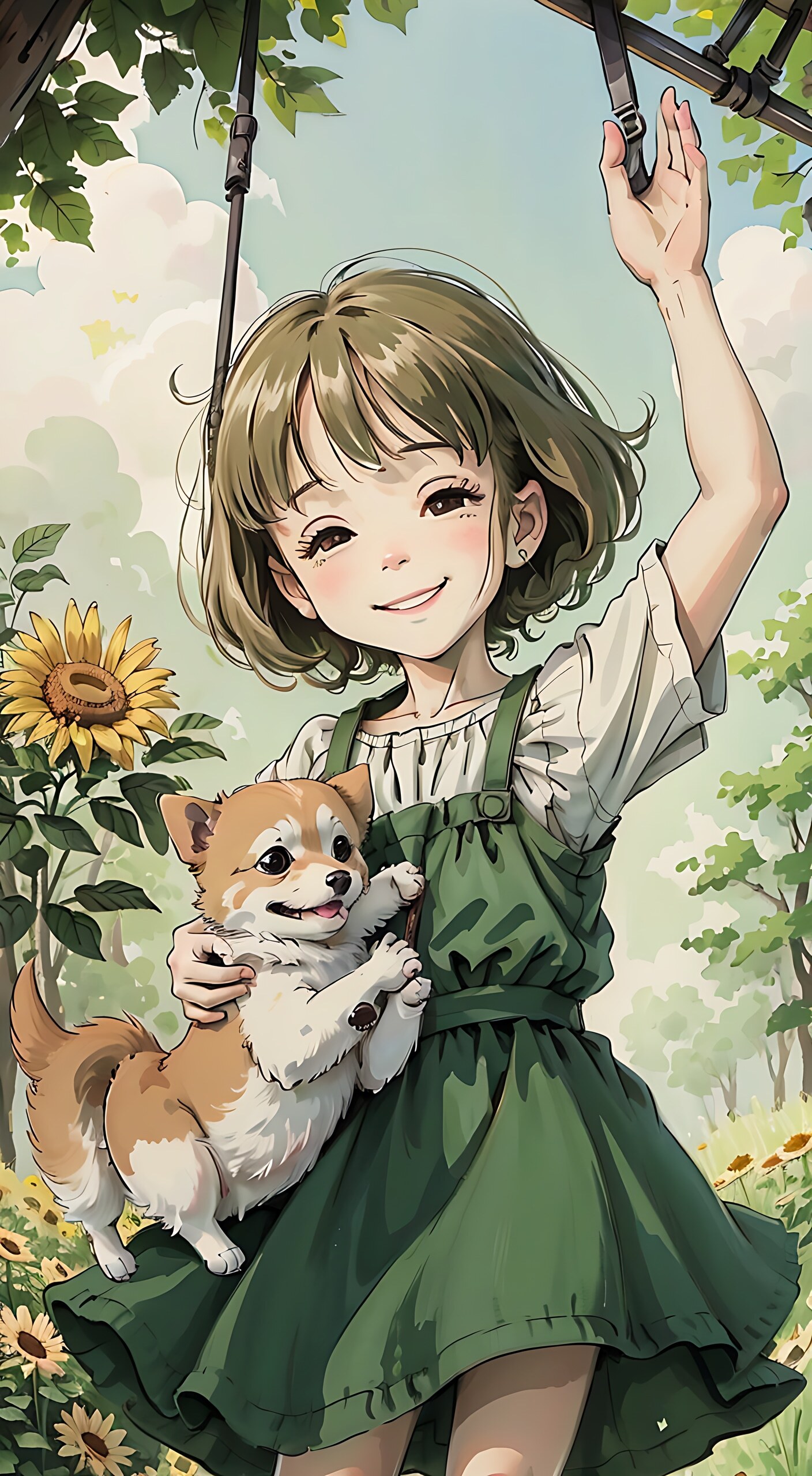 夏天,小女孩,穿着绿色连衣裙,正面,笑,开心,荡秋千,小狗,阳光, 整个画面背景简单,画面明亮,治愈