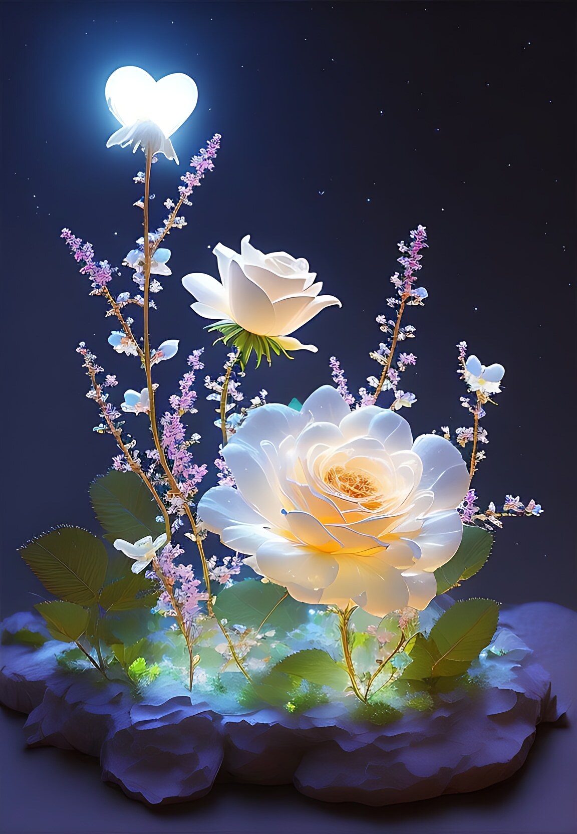 这是一朵柔和的玫瑰花,叶上有雨水落下花瓣清晰超逼真,绿色大叶子真实,闪亮的玫瑰花瓣漂浮在夜空中,形成了一颗闪闪发光的心,许多大的红玫瑰在海滩上形成了一个心,金色的erflies闪闪发光,长形的道路,光滑而透明的闪闪发光的生物和鹅卵石闪闪发光的道路,水晶透明,灯光效果,玫瑰,星光,梦幻,艺术光学艺术,高清,许多微小而多彩的发光生物,被银河照亮,超级细节,超高清,弧形8k,高清复杂的细节处理,高清,梦幻童话王国高清,颜色艳丽,花朵上晶莹的露珠,内部V发光。v1(点击复制)