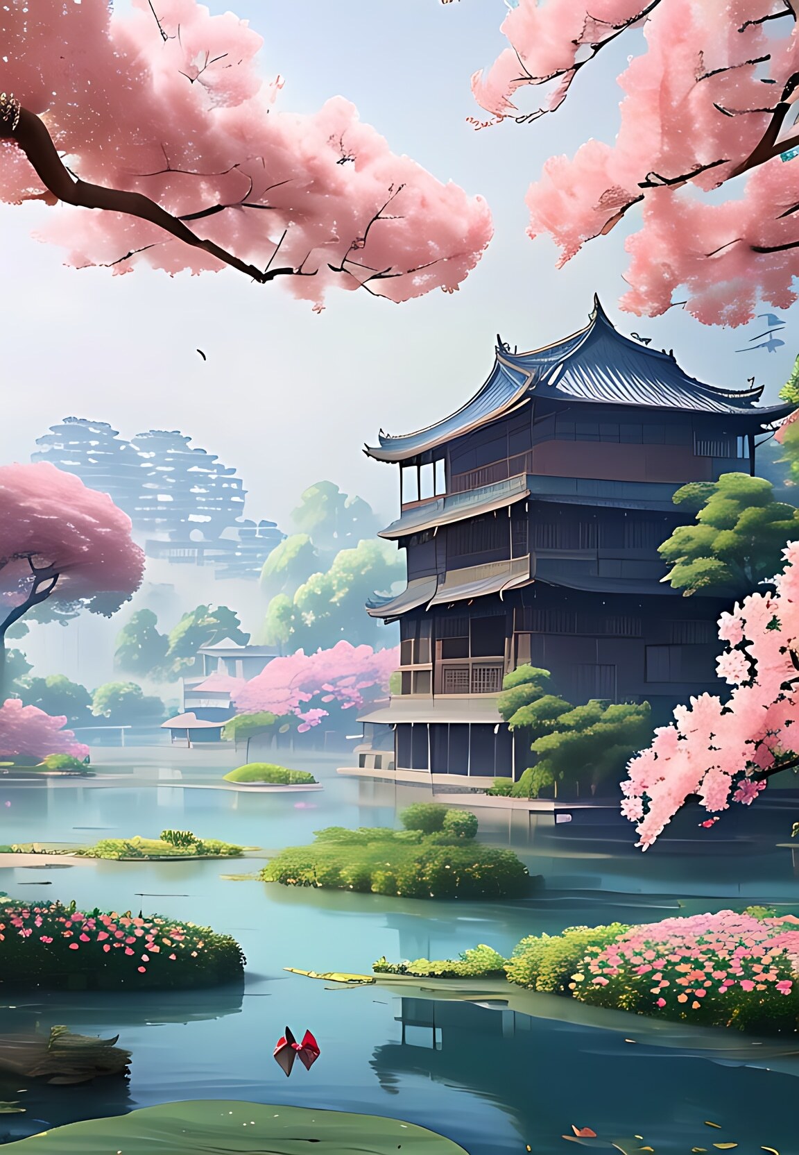 江南水乡美景,晴天,真实拍照感,超高清,房屋和树木,湖水,8k,超广角,近景,饱满,莲花,莲叶,桥,大师作品,真实写照