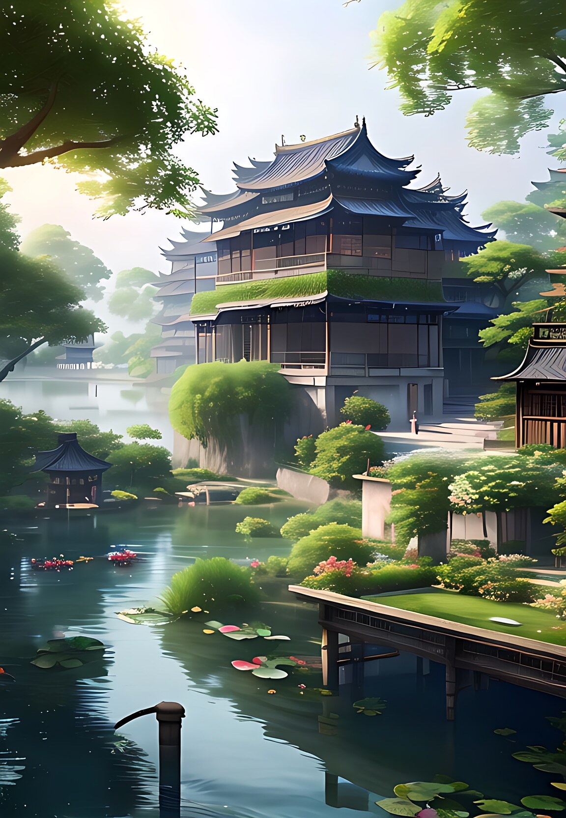 江南水乡美景,晴天,真实拍照感,超高清,房屋和树木,湖水,8k,超广角,近景,饱满,莲花,莲叶,桥,大师作品,真实写照