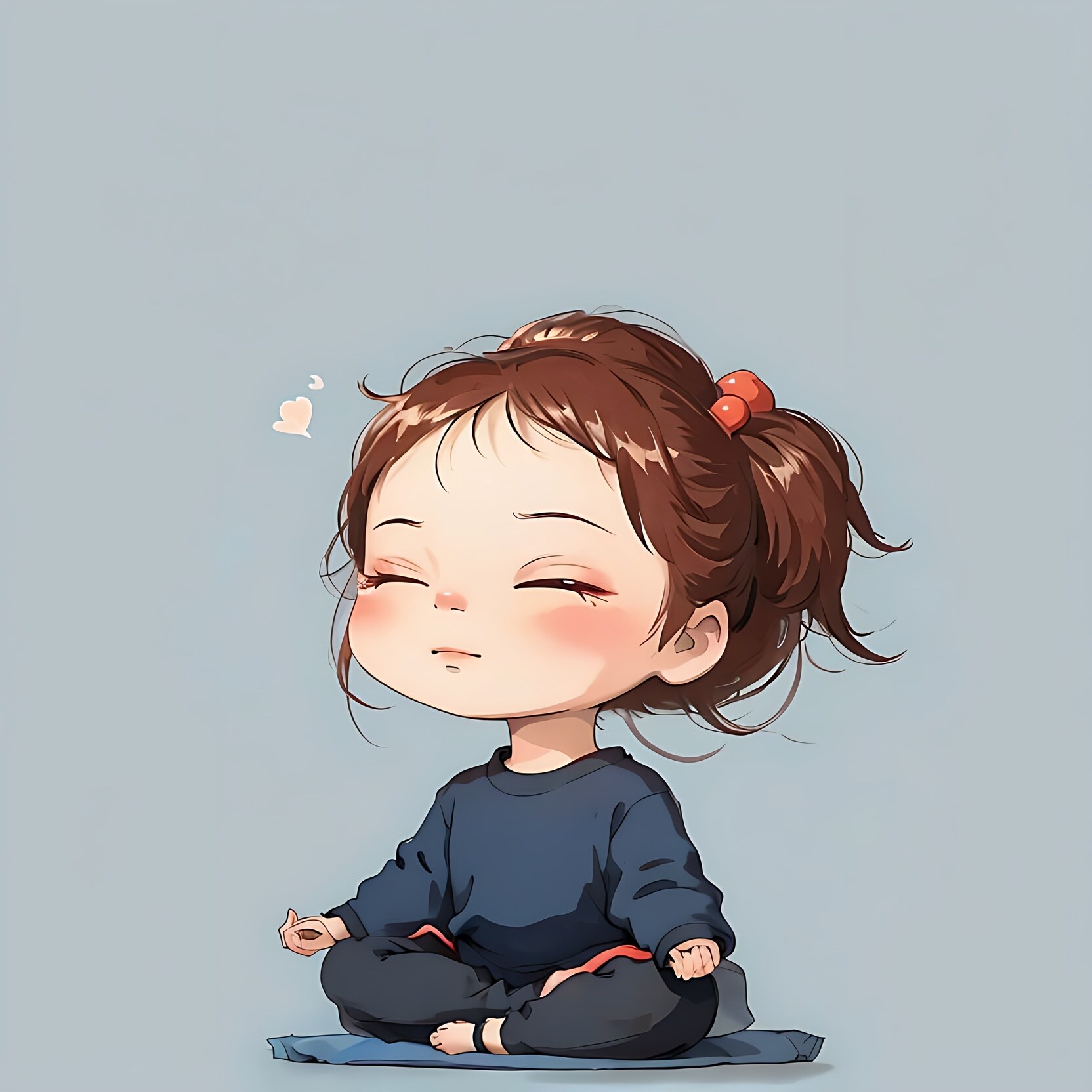 一个可爱女孩盘坐在垫子上,双手打坐放在两腿上,丸子头,闭着眼睛,五官精致,治愈唯美,超高清画质