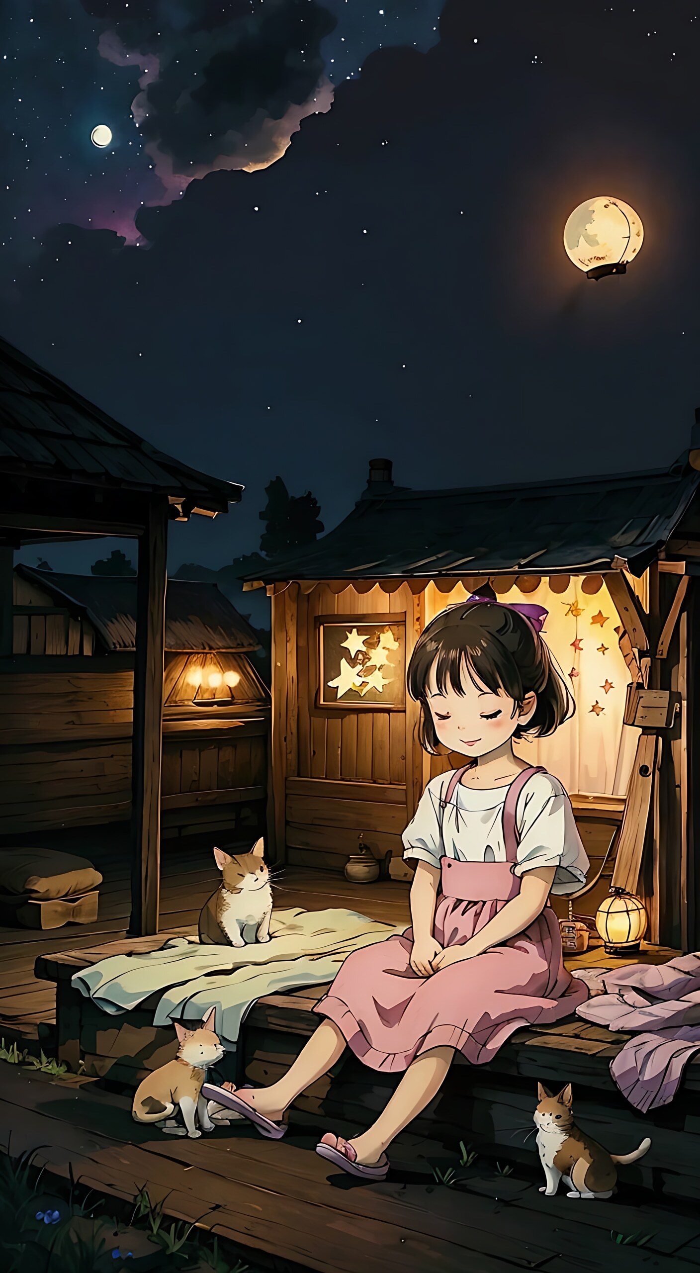 夏天夜晚,璀璨繁星,藏蓝的天空,圆圆的月亮,院子,小草,院子外的小树,小木房,木方旁边一张休闲床(突出重点:台灯,床,被子枕头,门帘,)小花猫,一个6岁可爱小女孩,茶色长发刘海,绑头发圆脸,单眼皮闭眼睛,闭眼睛超级可爱,嘴角微微上扬,自愈的微笑,脸色腮红,穿白色T恤短袖,粉紫色背带裙,粉色拖鞋,坐着,与参考图一样