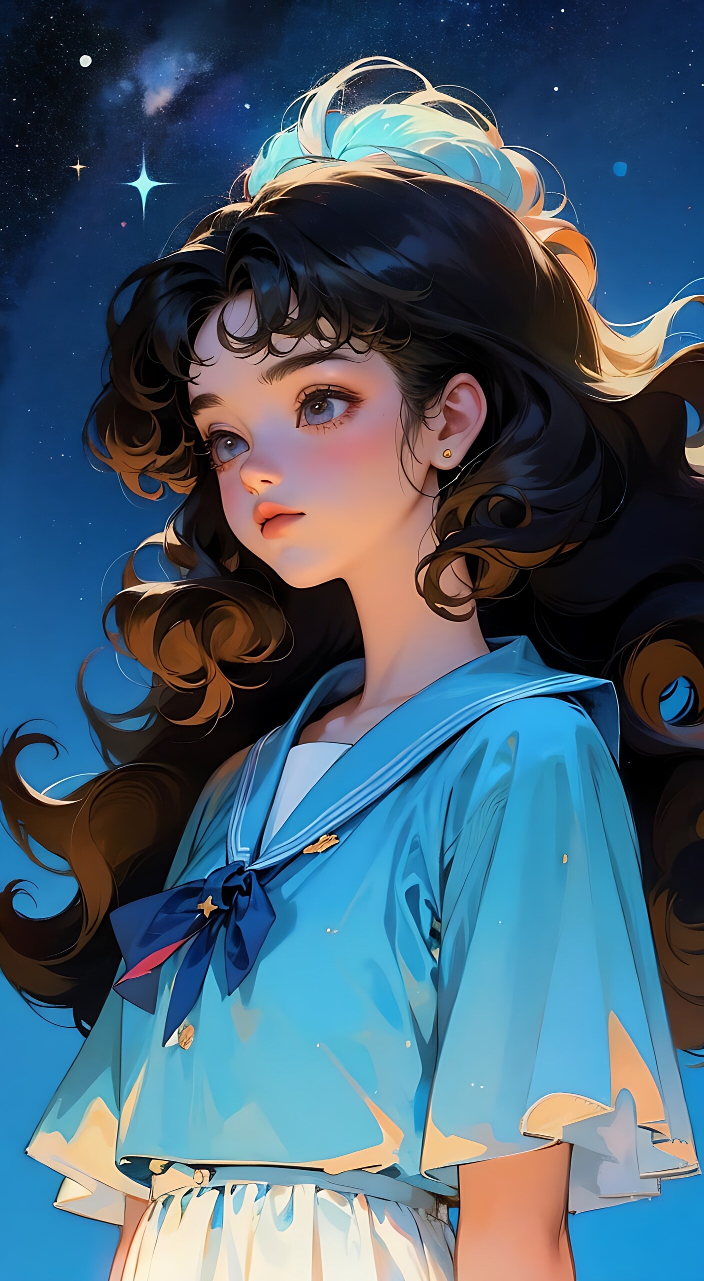 90年代的女孩,卷发,长发,黑发,红色蝴蝶结,淡蓝色加星光的背景