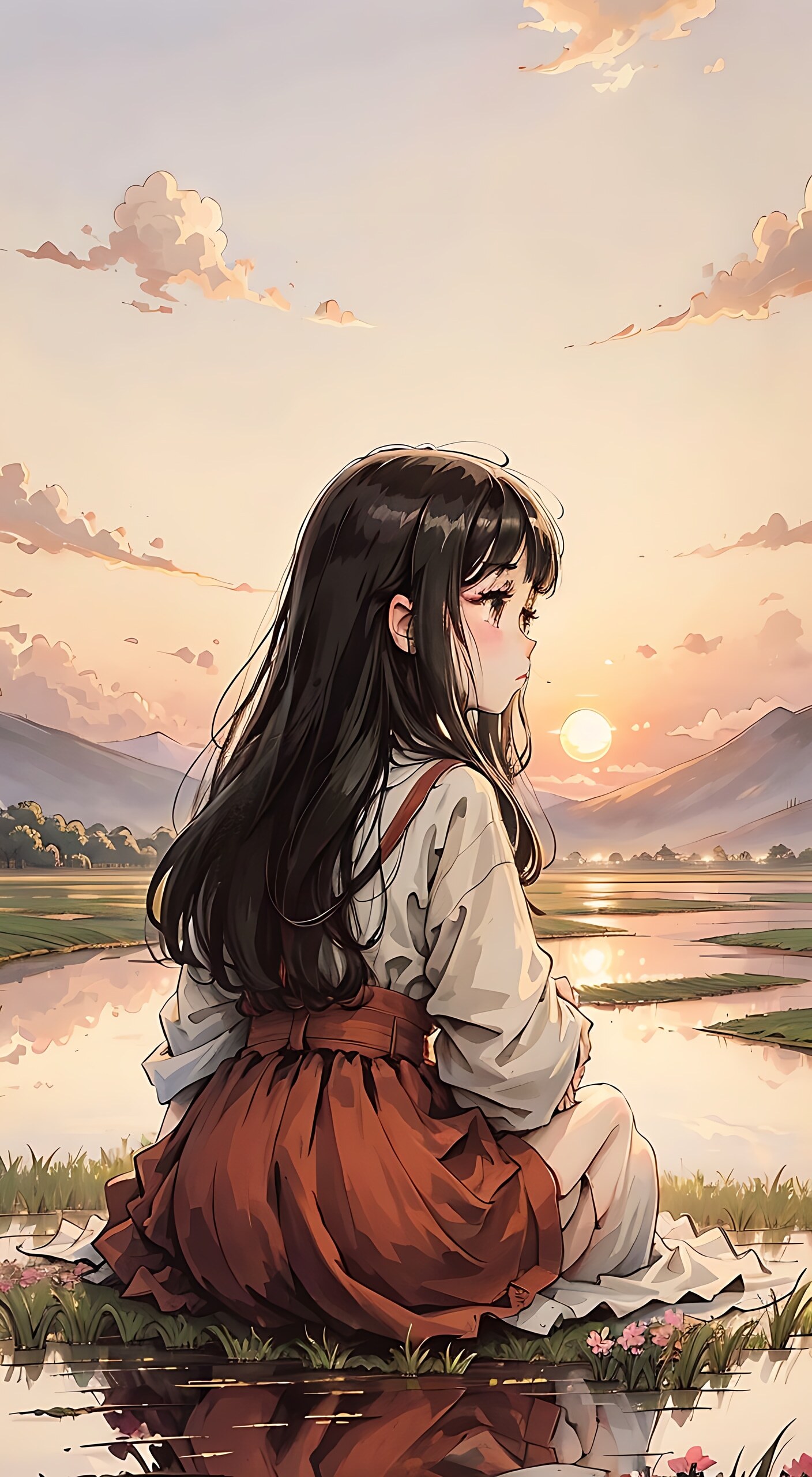 1个忧郁的小女孩,坐在田野,看向远方,黑色头发,日落天空晚霞,彩色的云,稻田,花,长发,穿着连衣裙,远景主要体现背景。晚霞,宫崎骏风格