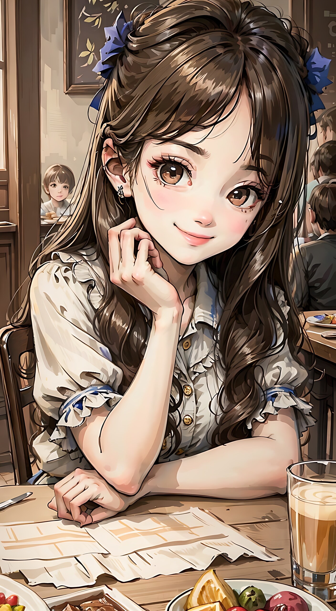 青春美少女,手支撑下巴,坐在桌边上,微笑的看着前方,