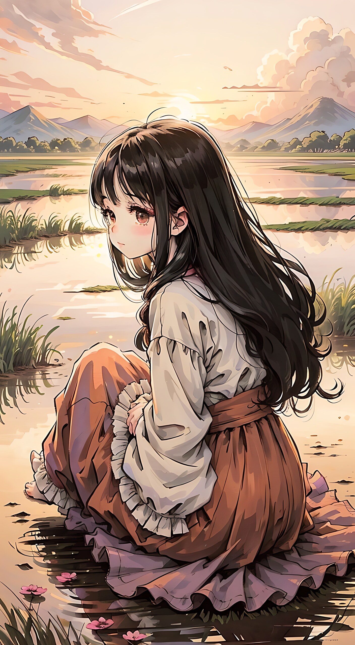 1个忧郁的小女孩,坐在田野,看向远方,黑色头发,日落天空晚霞,彩色的云,稻田,花,长发,穿着连衣裙,远景主要体现背景。晚霞,宫崎骏风格