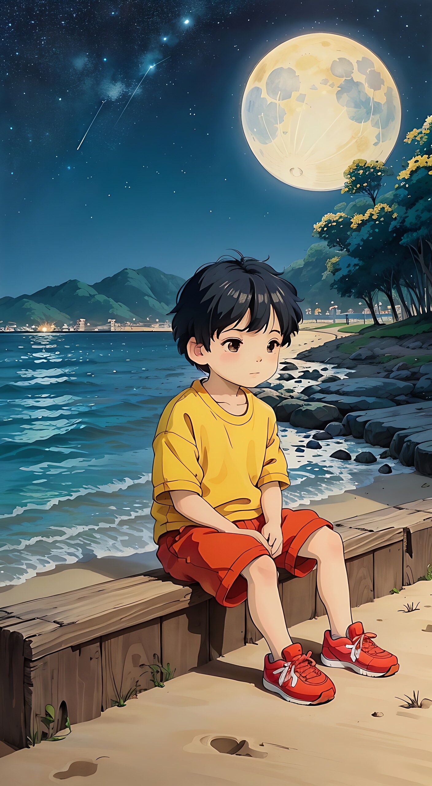 夏天夜晚,璀璨繁星,蔚蓝的天空,圆圆的月亮 ,一个小男孩,坐在海边,全身照,满脑忧伤,穿黄色的短运动衣,红色运动鞋,黑色头发,有花草,宫崎骏风格,其他小动物一个小男孩,圆圆的脸大眼睛长睫毛,