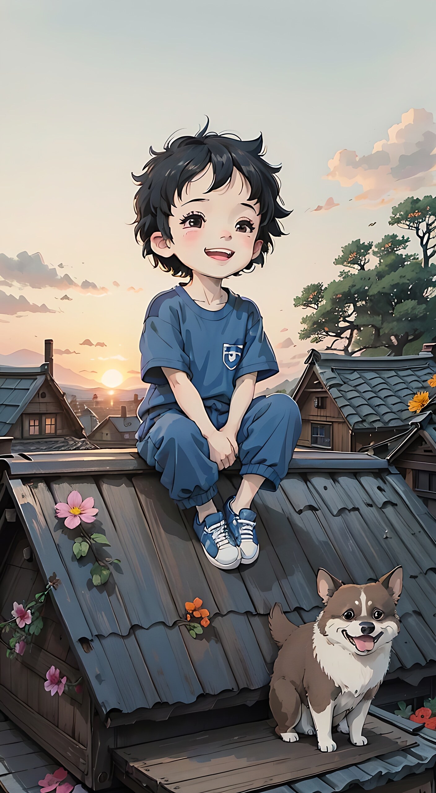 一个开心的小男孩,短头发坐在房顶上,旁边一只小柴犬,全身照,哈哈大笑,穿蓝色的短运动衣,粽色运动鞋,黑色头发,有房子,有花草,宫崎骏风格,圆圆的脸大眼睛长睫毛,日落夕阳