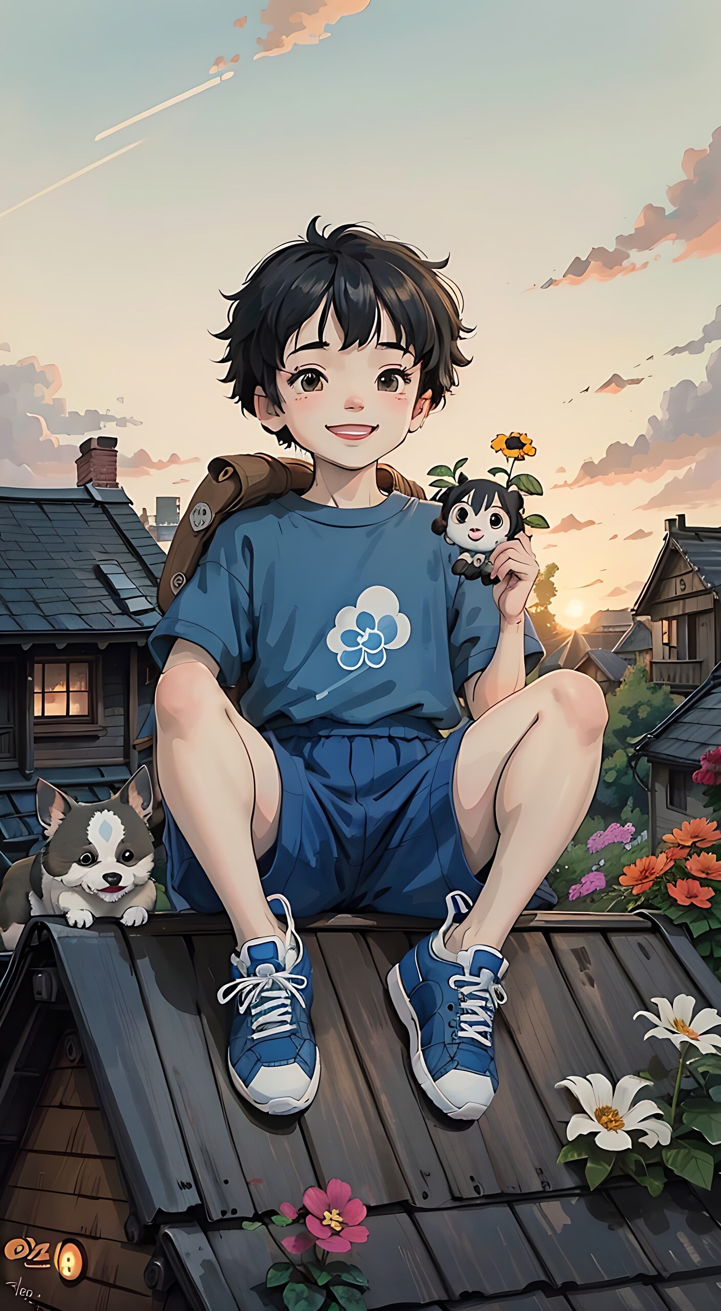 一个开心的小男孩,短头发坐在房顶上,旁边一只小柴犬,全身照,哈哈大笑,穿蓝色的短运动衣,粽色运动鞋,黑色头发,有房子,有花草,宫崎骏风格,圆圆的脸大眼睛长睫毛,日落夕阳