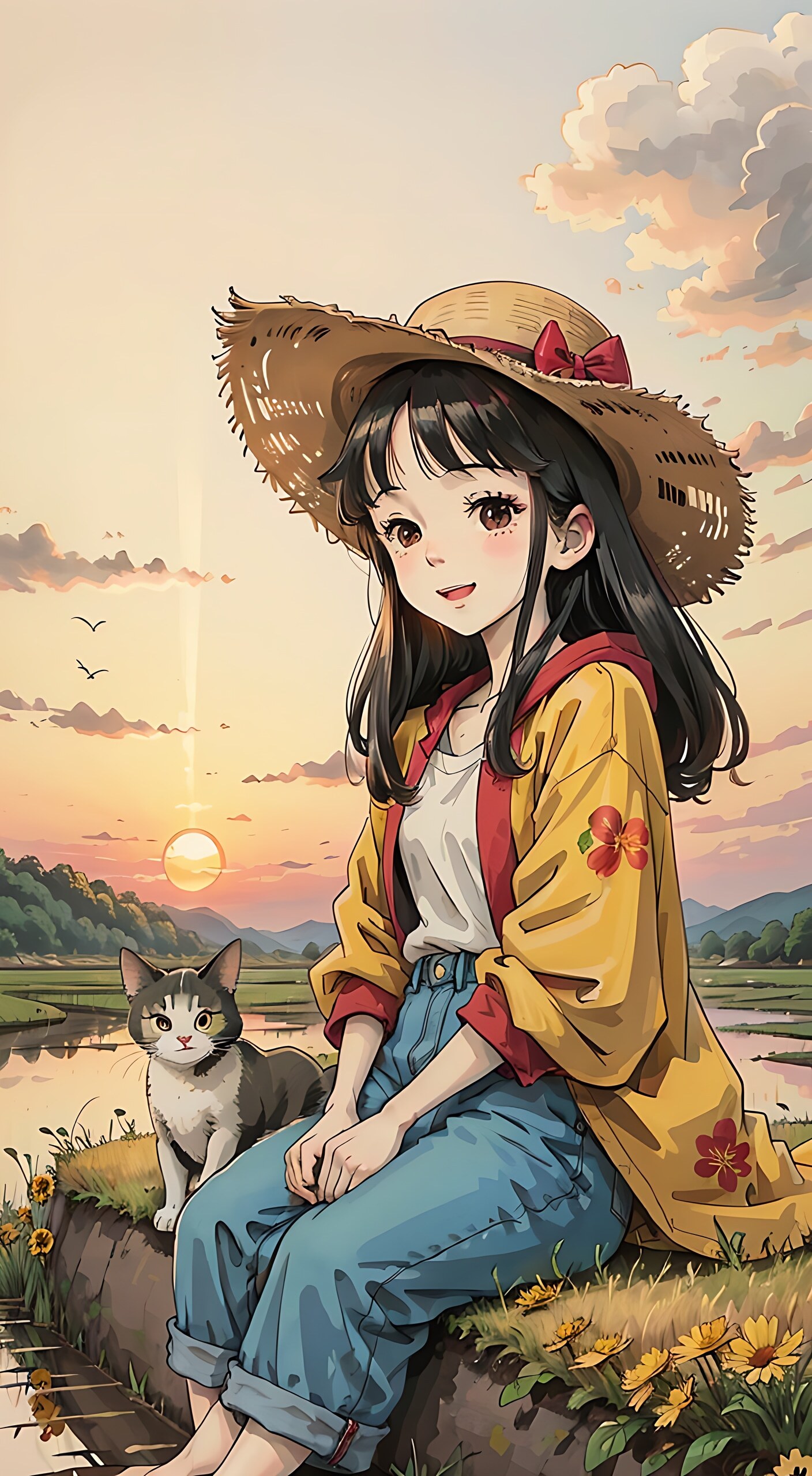 1个开心的小女孩孩和小猫,草帽,坐在田野,长头发,日落天空晚霞,黄狗,稻田,花,短发,汉服,大雁,红色外套,牛仔运裤