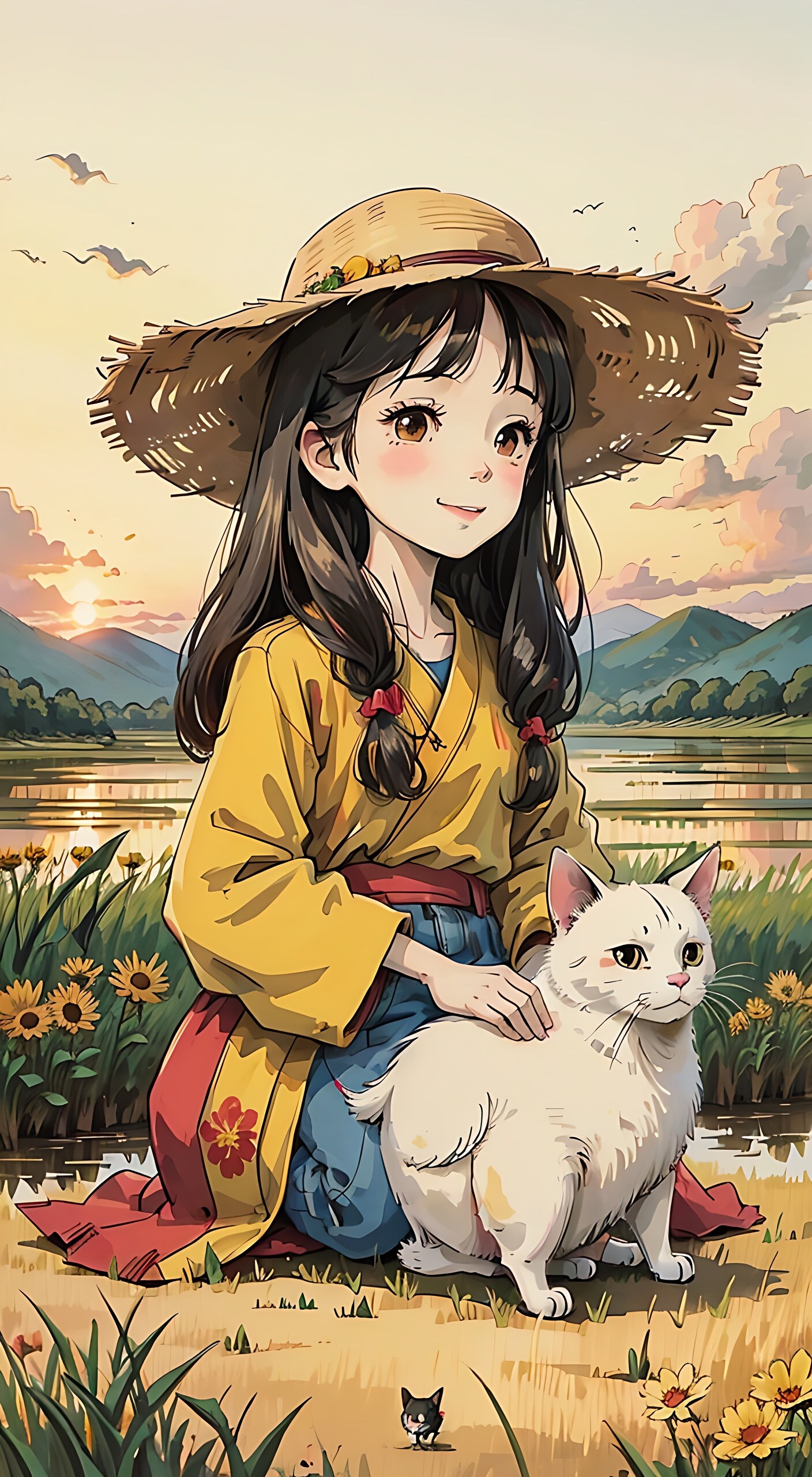 1个开心的小女孩孩和小猫,草帽,坐在田野,长头发,日落天空晚霞,黄狗,稻田,花,短发,汉服,大雁,红色外套,牛仔运裤(点击复制)