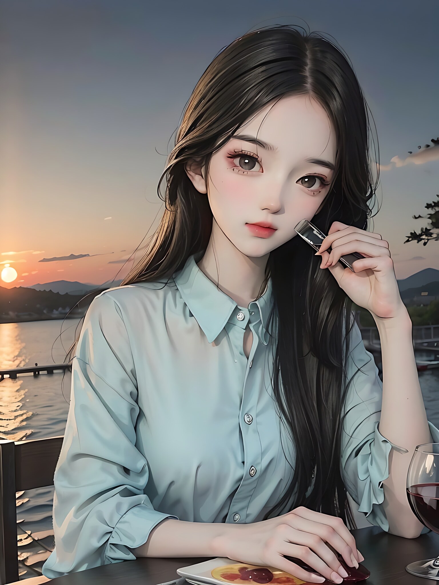 甜美女孩坐在桌子边,黑色长直发,黑色的瞳孔,伤心的端着酒杯,夏季,晚霞,宫崎骏漫画,4k高清