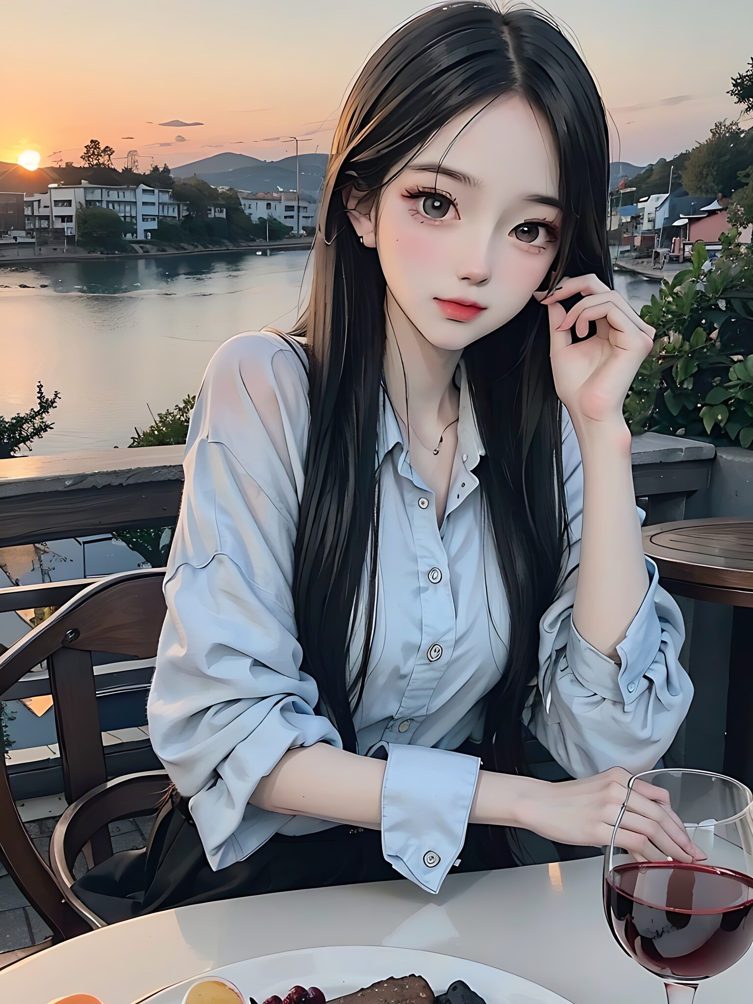 甜美女孩坐在桌子边,黑色长直发,黑色的瞳孔,伤心的端着酒杯,夏季,晚霞,宫崎骏漫画,4k高清