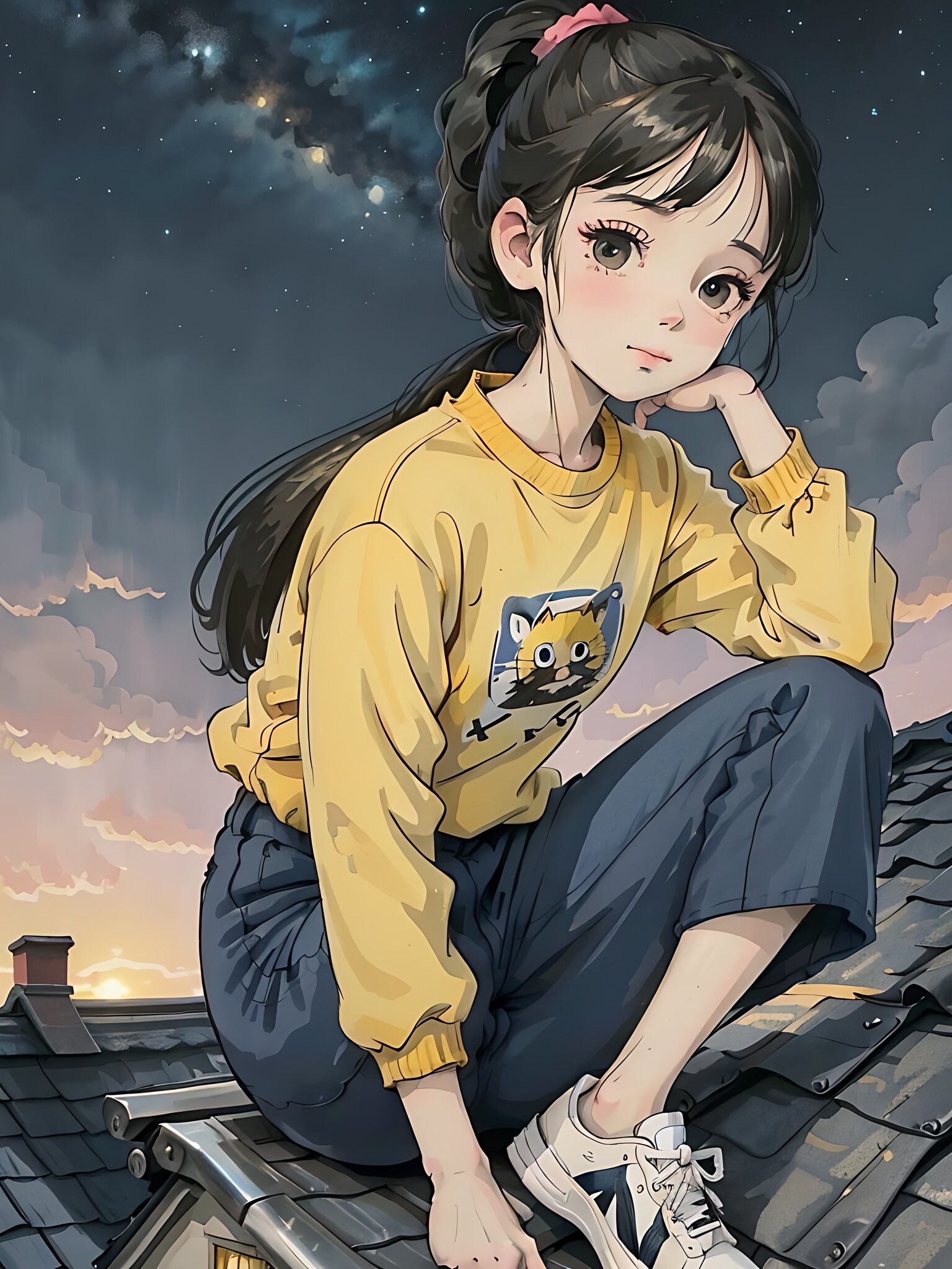 真人1个开心的小女孩和小猫,坐在房顶上,全身照,重点:黄色上衣,黑色裤子,白色运动鞋,高马尾(重点高马尾),有房子,有天空,有日落,有夕阳,宫崎骏风格,一个忧伤的小女孩,圆圆的脸大眼睛长睫毛,夜空