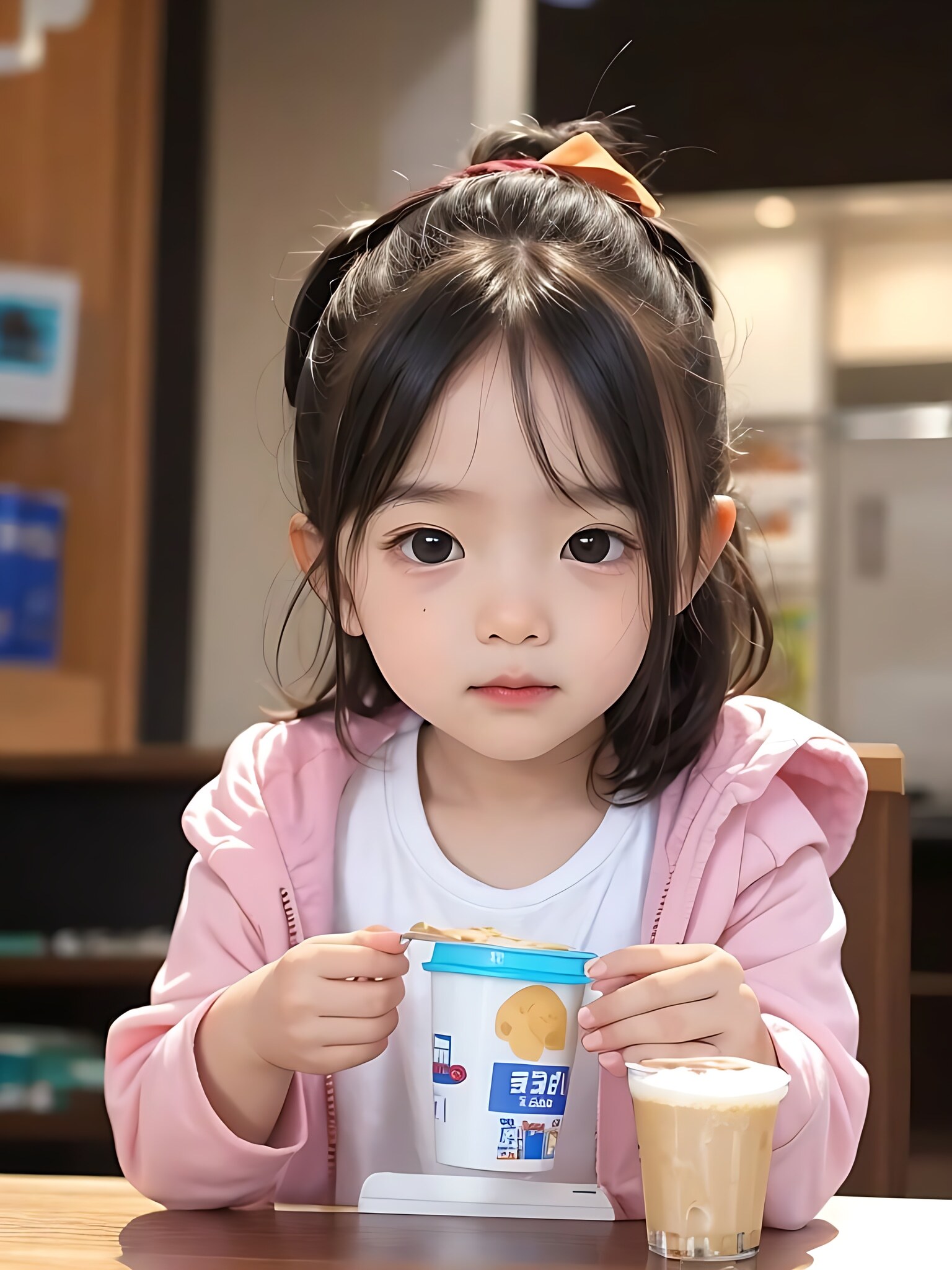 一个小女孩喝着奶茶