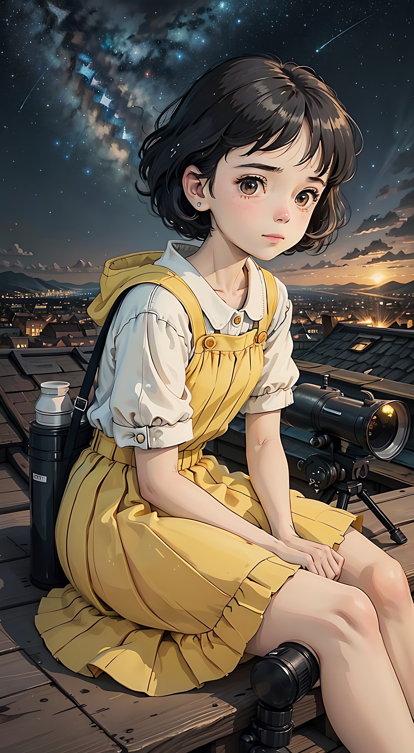 一个可爱的12岁女孩坐在屋顶上,旁边放着她的望远镜,黑色短头发,闪闪发光的眼睛,穿着黄色短袖,长裙,有个望远镜,侧身坐,侧脸抬头,在观察晴朗的夜空中可见的星座和行星,流星,银河,天际线,黑暗的灯光,高清4k,电影画质