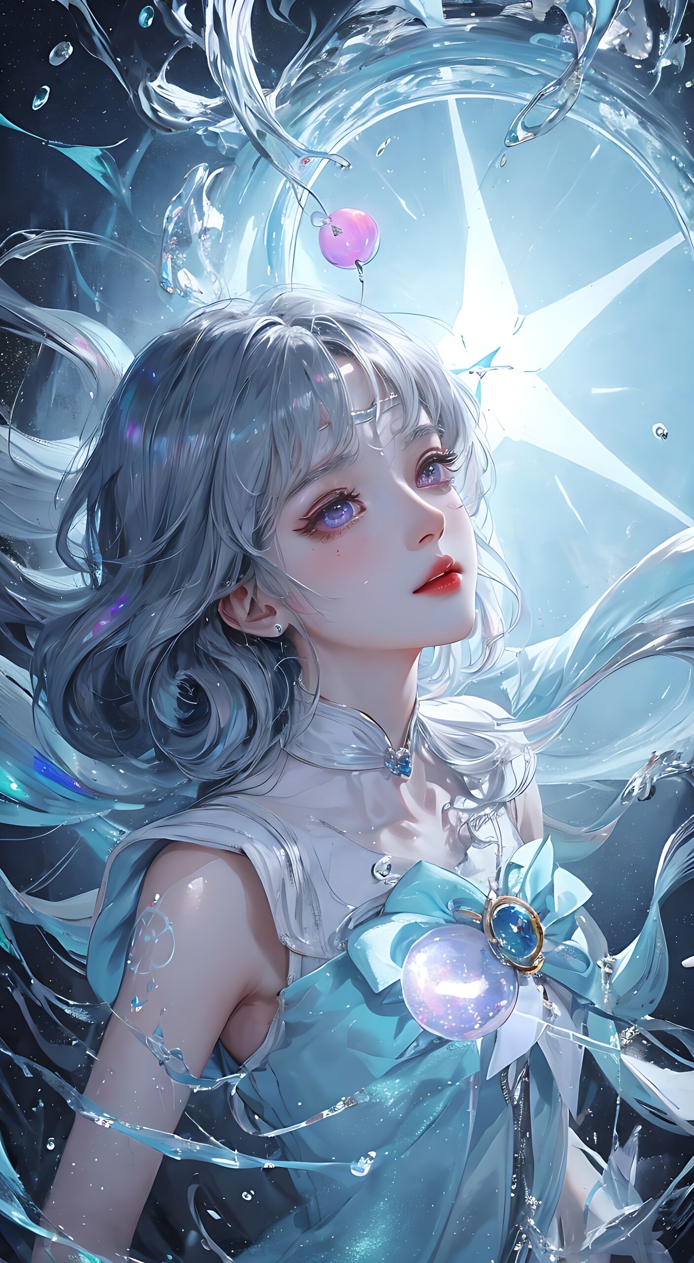 Sailor moon in the sky, with a silver body and glitters with lights above,extreme iridescent reflection, in the style of vray tracing, vibrantmanga, shiny/ glossy, rococo pastel, fluid form, tinycore, fluid impressions, vray, machine aesthetics, yanjun cheng, silver, shiny eyes, fluidform.(点击复制)
