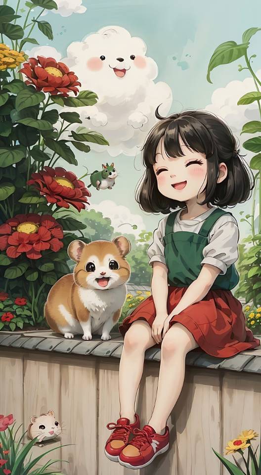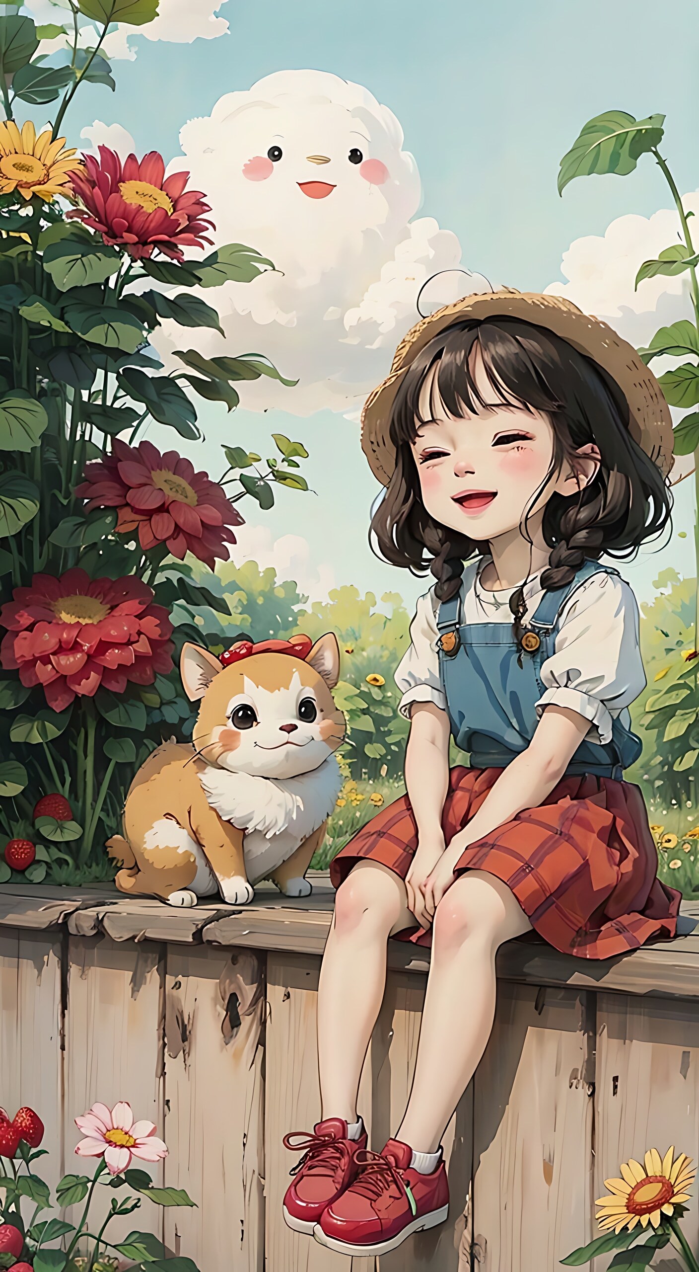 甜美少女,可爱,鹅蛋脸,哈哈大笑,穿牛仔背带裙子,年轻阳光,可爱,手里拿着草莓,两个麻花辫,有刘海,戴着大草帽子,正视着我,阳光通透,光影明显,精致的五官,高质量CG,8k分辨率,电影画质,氛围温暖,灿烂。