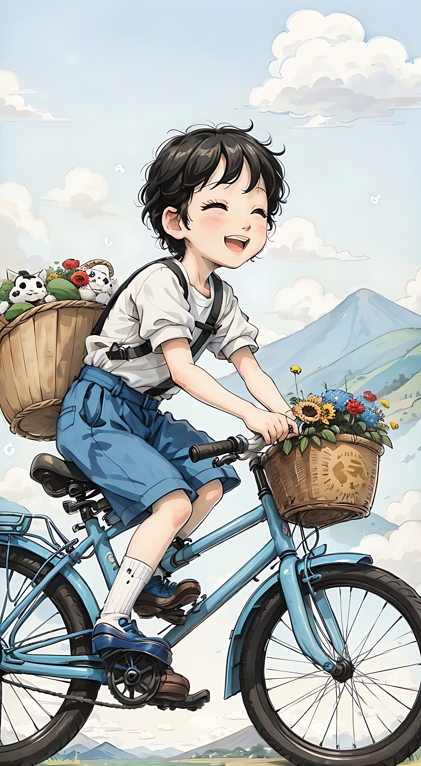 一个开心的小男孩,骑着单车,车筐里放着熊猫幼崽,哈哈大笑,蓝色短袖,黑色头发,高山,麦田,玫瑰花海,宫崎骏风格,鲜花,蓝天白云,其他小动物一个开心的小女孩,瓜子脸大眼睛长睫毛,踩着单车,哈哈大笑,有风吹来