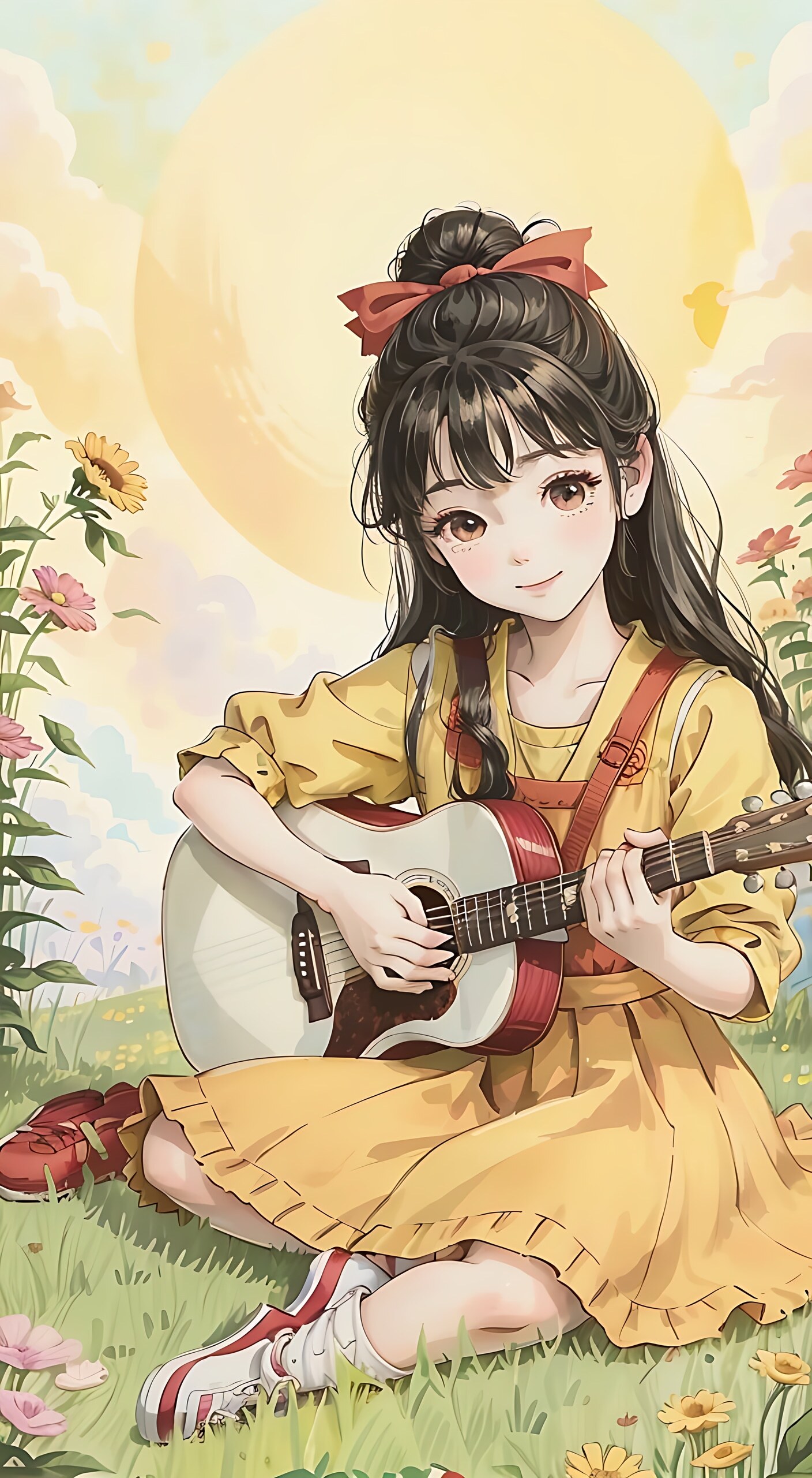 一个开心的小女孩,坐在草坪上,全身照,开心的弹着吉他,开心的唱着歌,穿天黄色的裙子,红色运动鞋,黑色头发,有房子,有花草,宫崎骏风格,其他小动物一个开心的小女孩,圆圆的脸大眼睛长睫毛,日落夕阳