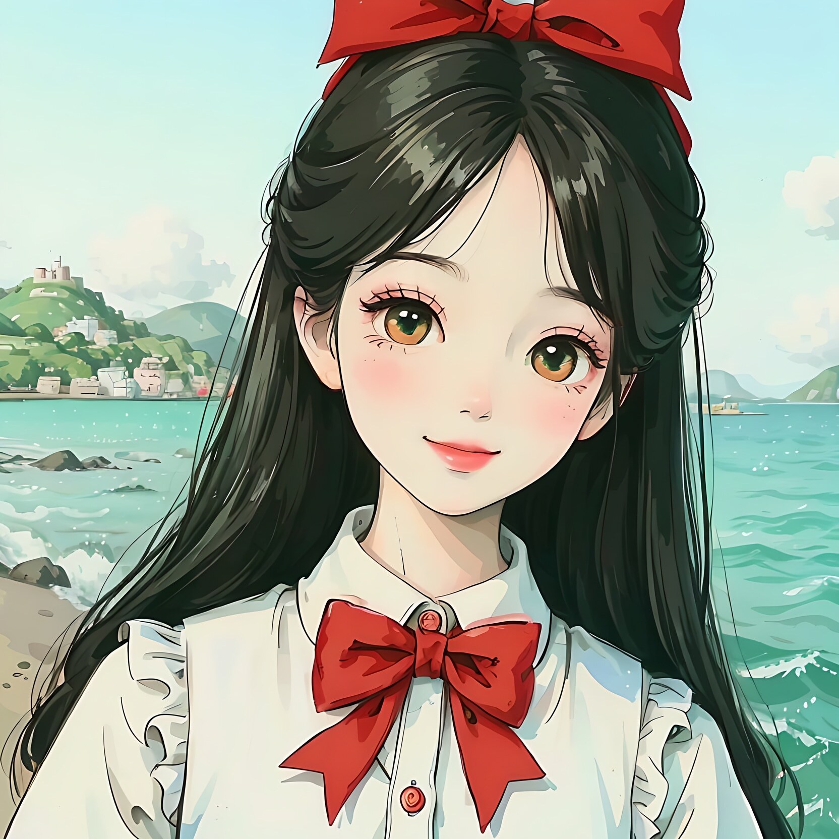 一个漂亮可爱的长发女孩,小萝莉,最高画质,精美画面,丁达尔效应,大眼睛,黑头发长睫毛,红色毛衣裙,头戴蝴蝶结,完美五官,清晰脸庞面对观众,精致嘴唇,微笑,干净唯美的海边背景,温柔的光线,绿色为主,简单化