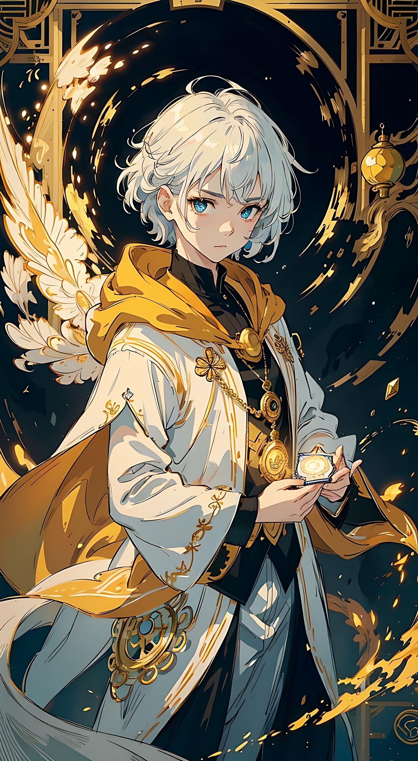 10岁的男孩,精致的头发,白发,异色瞳,清冷,精致的短发,32K,高分辨率,十分宽松的衣服,冷漠,戴着金色边的白色兜帽,hood up,黑色短裤,白色与金色花纹纹路,漂浮的有金色边棱的纯黑扑克牌,漂浮的镜片与镜面装饰,修长手指,双手持着的悬浮于空中的金色骰子立方体(有着复杂精美的花纹),巨大的金色时针指针背景,傲慢冷淡,raking light with back light,pentacle,fingerless gloves,half gloves,ankle garter,特写,水滴吊坠,magatama,细项圈,昂头,仰视的视角,精致的环境刻画,精致的头发刻画,精致的眼睛刻画,精致的刻画,完美的五官刻画,最高品质,极致细节,精致的头发刻画,精致的眼睛刻画,精致的五官刻画,精致的衣服刻画,精致的眼神刻画,4K画质,高分辨率,单人,center the composition --ar 3:2 --niji 5(点击复制)