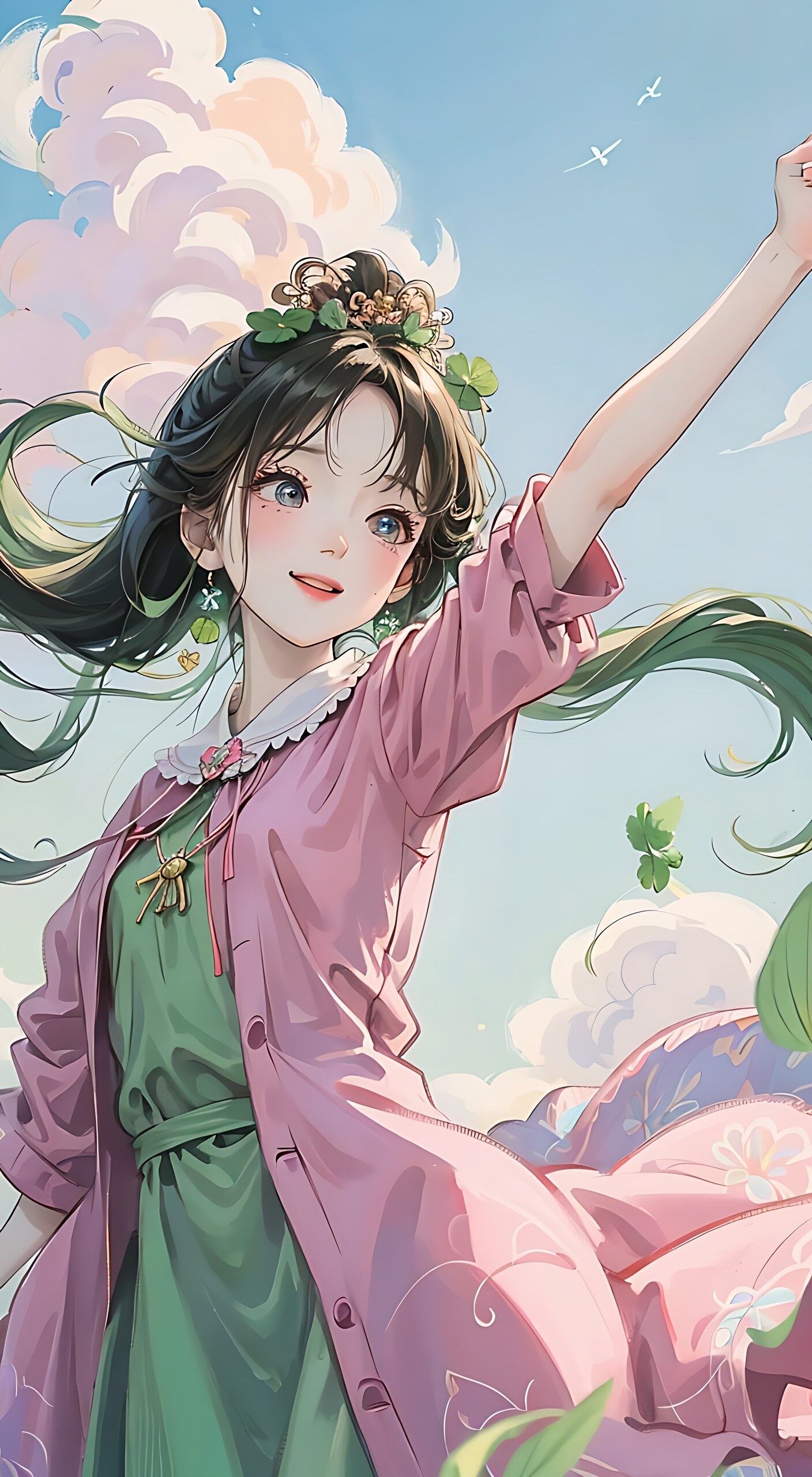 一个穿着粉色裙子的女孩 大眼睛长睫毛望着天空,开心的笑着跳着舞 长卷发 四叶草阳光,治愈系,绿色四叶草背景 蓝天白云,高清细节(点击复制)
