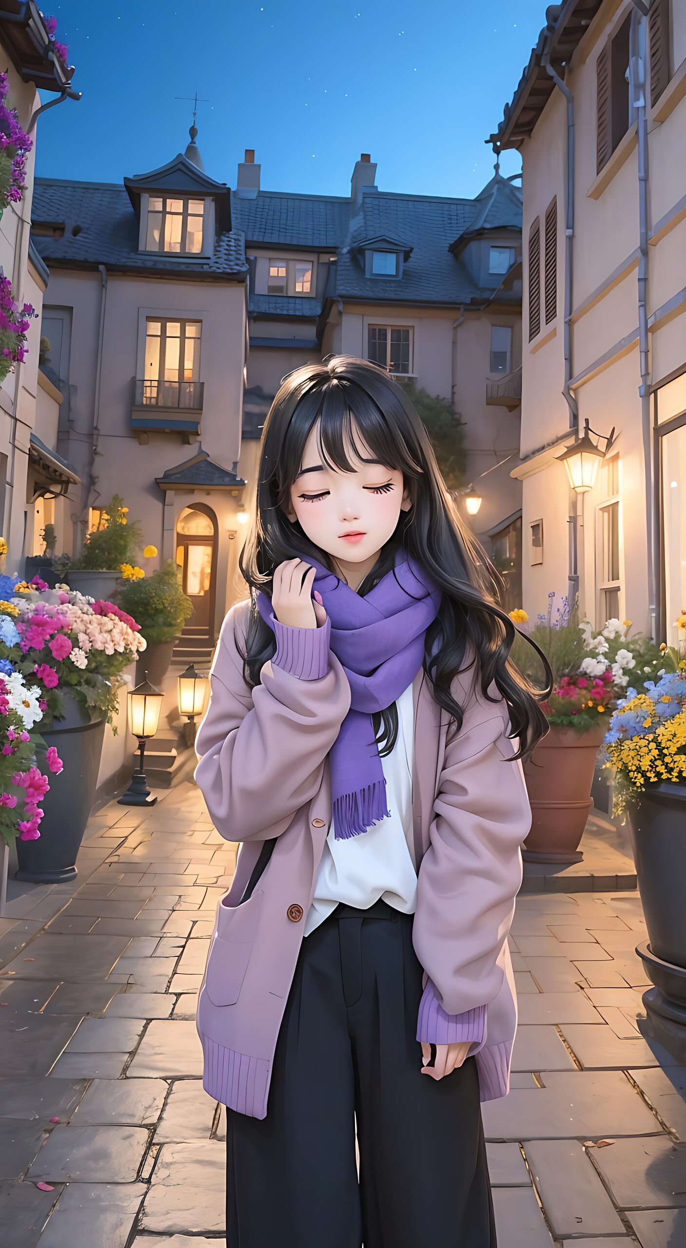 在一个满是鲜花的庭院里,一个穿着紫色卫衣和卫裤的女孩站着。她戴着围巾,拥有大大的眼睛和长长的睫毛。她眼睛微微闭合,她的黑色长卷发和刘海完美的搭配在她的脸上。她的面容严肃,她的双手前伸,接住一片落叶,在正面照和远景照的8k超高清画质中都能体现出来。即使是夜晚,全身照也令人难忘。