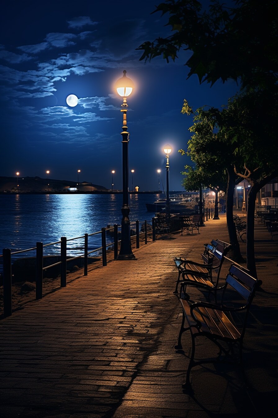 Night, quiet seaside, a full moon hanging in the sky, dewdrops, wet floor, a boat floating on the sea, the pier is lit with street lights, the roadside is also lit with street lights, a wooden chair is illuminated by street lights, several Green leaves do foreground, real photography style, super high definition, high resolution, 32K --v 5.2(点击复制)