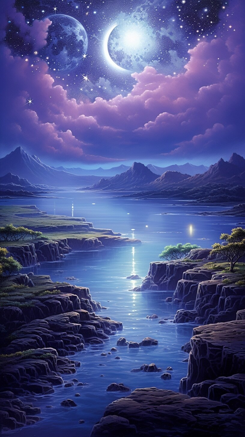 a beautiful night landscape with the moon, stars and moon with blue water in the middle, in the style of the stars art group (xing xing), dark azure and silver, luminous fantasies, [david nordahl], light purple and light gold, dark blue and white --ar 71:120(点击复制)