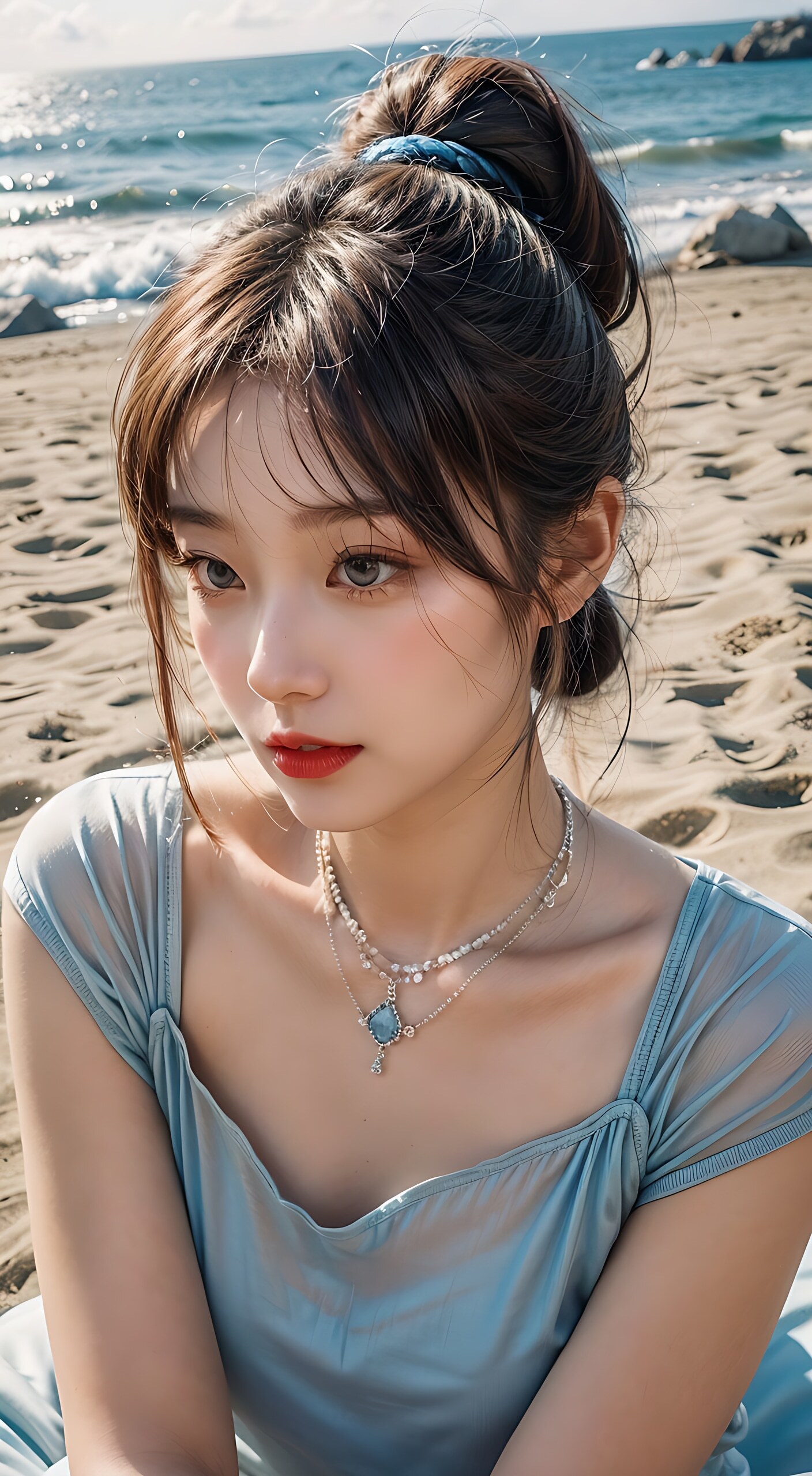 高冷女神,苗条身材,透明的肌肤,华丽的高光,蓝色的宝石项链,在沙滩,绝美的,迷人的红唇,黑色高马尾头发,闪耀的,美丽年轻女孩,可爱