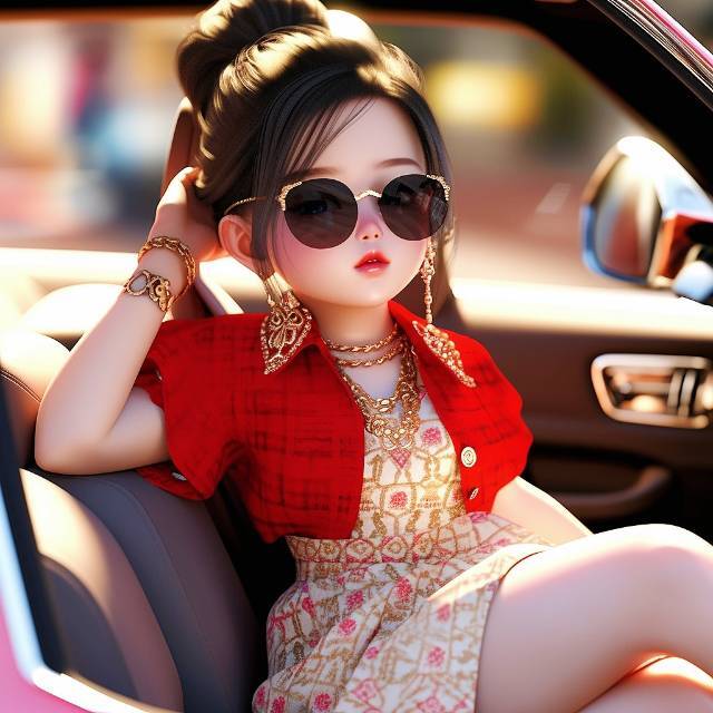 a girl with a lot of make up in a car with sunglasses, in the style of childlike innocence and charm, gongbi, light bronze and red, 32k uhd, elegant clothing, red threads, rich
