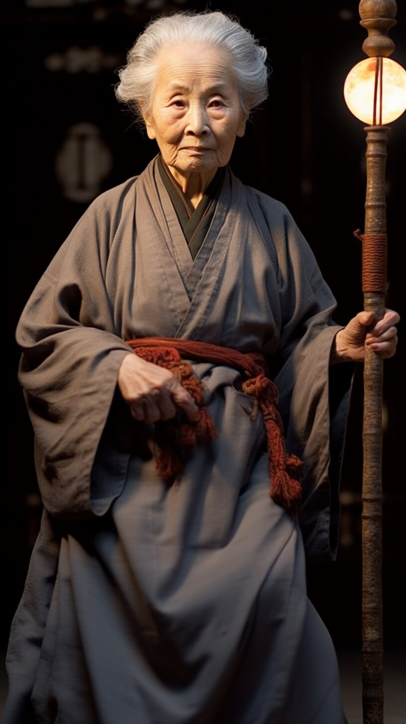 一个漂亮老婆婆,盘发头,满头白发,身穿麻布旧衣裳,中国风范,高高的鼻梁,拄着龙头拐杖,盘坐门前,正面全身照,正视前方,高清,白天,亮堂堂,背景屋前,超高清