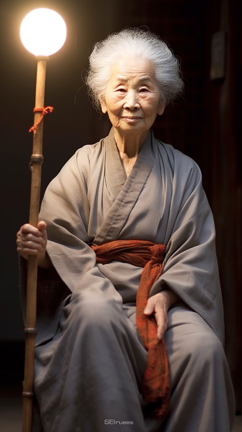 一个漂亮老婆婆,盘发头,满头白发,身穿麻布旧衣裳,中国风范,高高的鼻梁,拄着龙头拐杖,盘坐门前,正面全身照,正视前方,高清,白天,亮堂堂,背景屋前,超高清