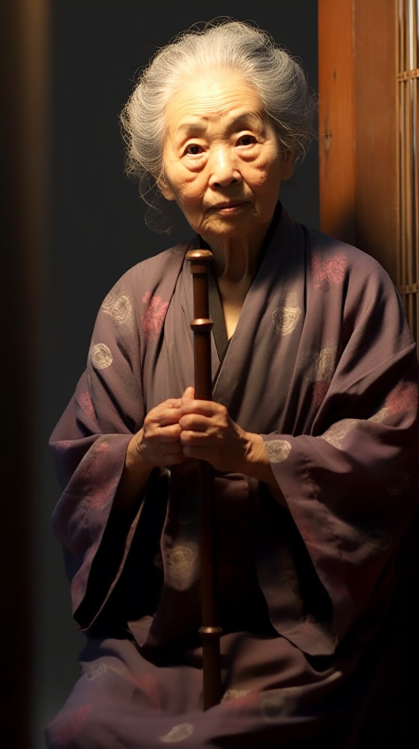 一个漂亮老婆婆,盘发头,满头白发,身穿麻布旧衣裳,中国风范,高高的鼻梁,拄着龙头拐杖,盘坐门前,正面全身照,正视前方,高清,白天,亮堂堂,背景屋前,超高清