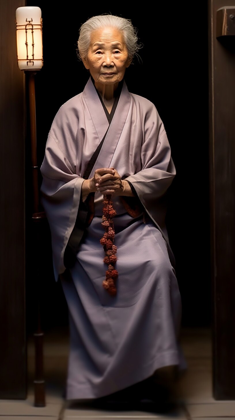 一个漂亮老婆婆,盘发头,满头白发,身穿麻布旧衣裳,中国风范,高高的鼻梁,拄着龙头拐杖,盘坐门前,正面全身照,正视前方,高清,白天,亮堂堂,背景屋前,超高清(点击复制)