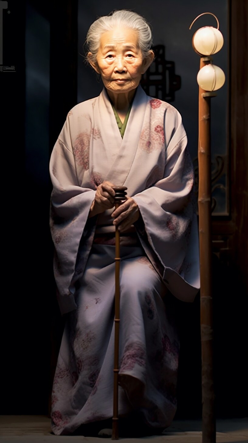 一个漂亮老婆婆,盘发头,满头白发,身穿麻布旧衣裳,中国风范,高高的鼻梁,拄着龙头拐杖,盘坐门前,正面全身照,正视前方,高清,白天,亮堂堂,背景屋前,超高清