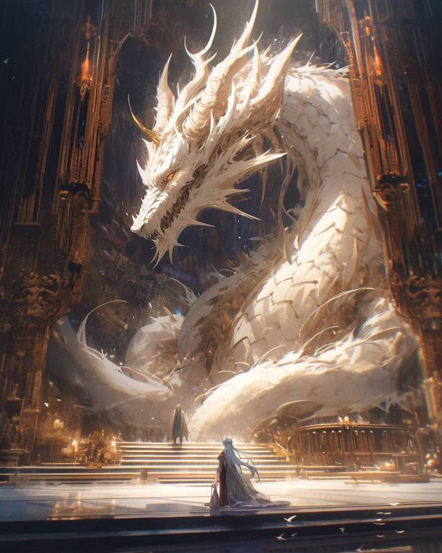 a white dragon with a woman standing outside a building, in the style of golden palette, nightcore, mysterious realism, hall of mirrors, kushan empire, strong sense of light, lyco art --ar 4:5