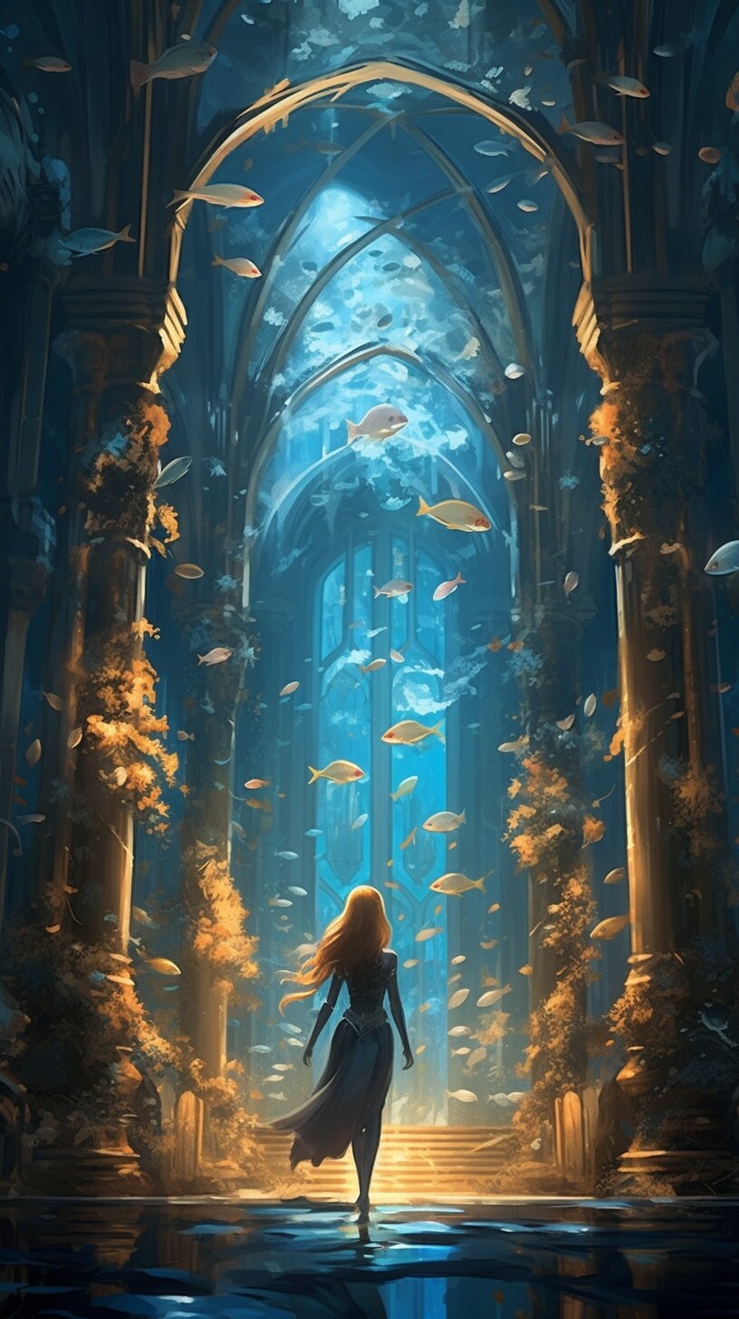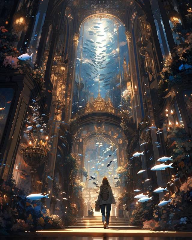 hd wallpapers aquarium concept painting image size 18991944, in the style of fine art nouveau, [rui palha], anime aesthetic, i can't believe how beautiful this is, dark cyan and gold --ar 4:5
