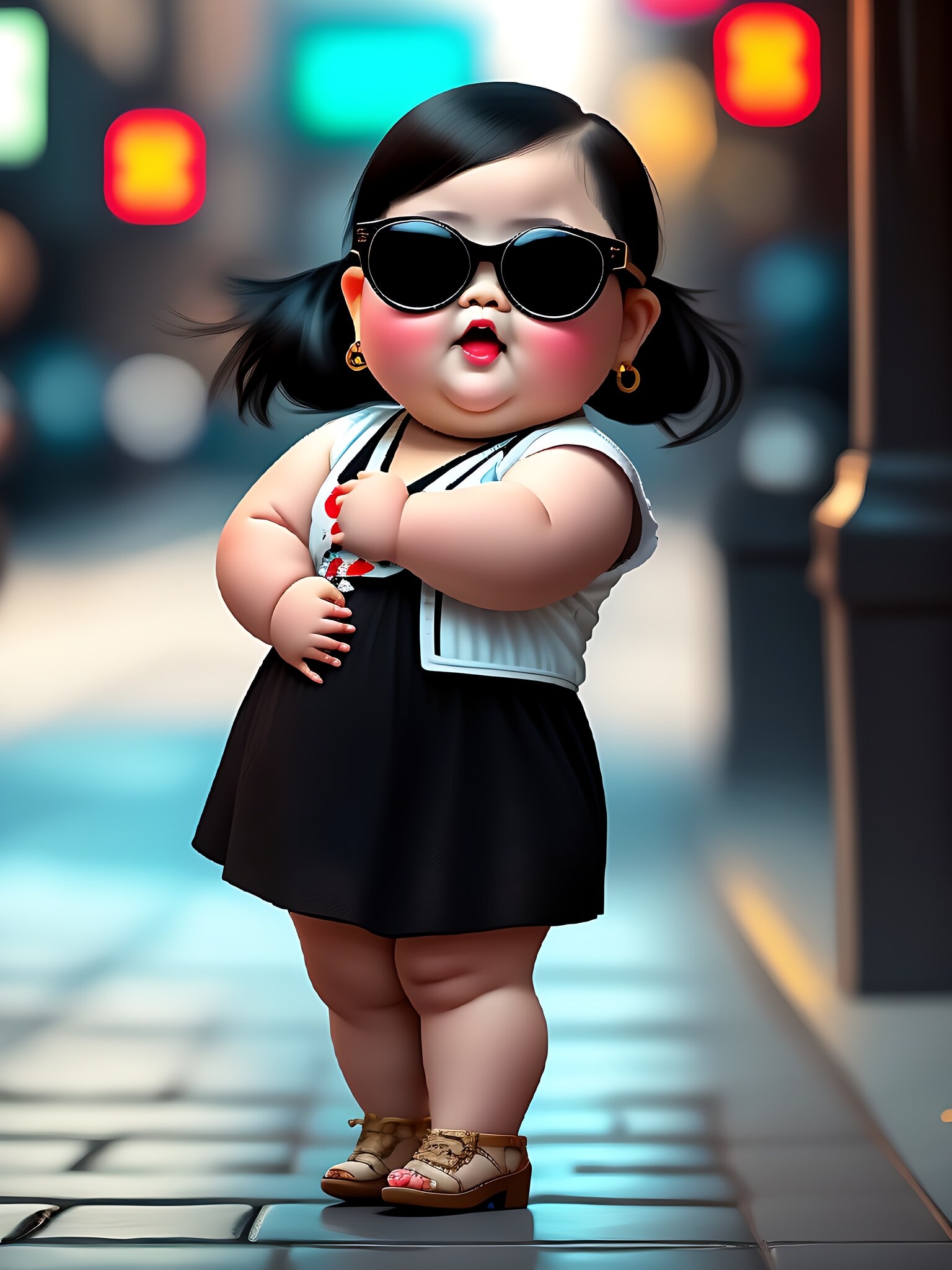 一名圆圆胖胖中国小女孩,圆圆的大脸,圆乎乎的四肢,惊讶夸张的表情,可爱的头发,带着墨镜,可爱的裙子,活泼开朗,夸张的走路姿势,手提包,背景干净,hq,超角度运动姿势,动态角度,16k,超清晰细节,辛烷值渲染,HD,背景夜晚,路灯,背后黑