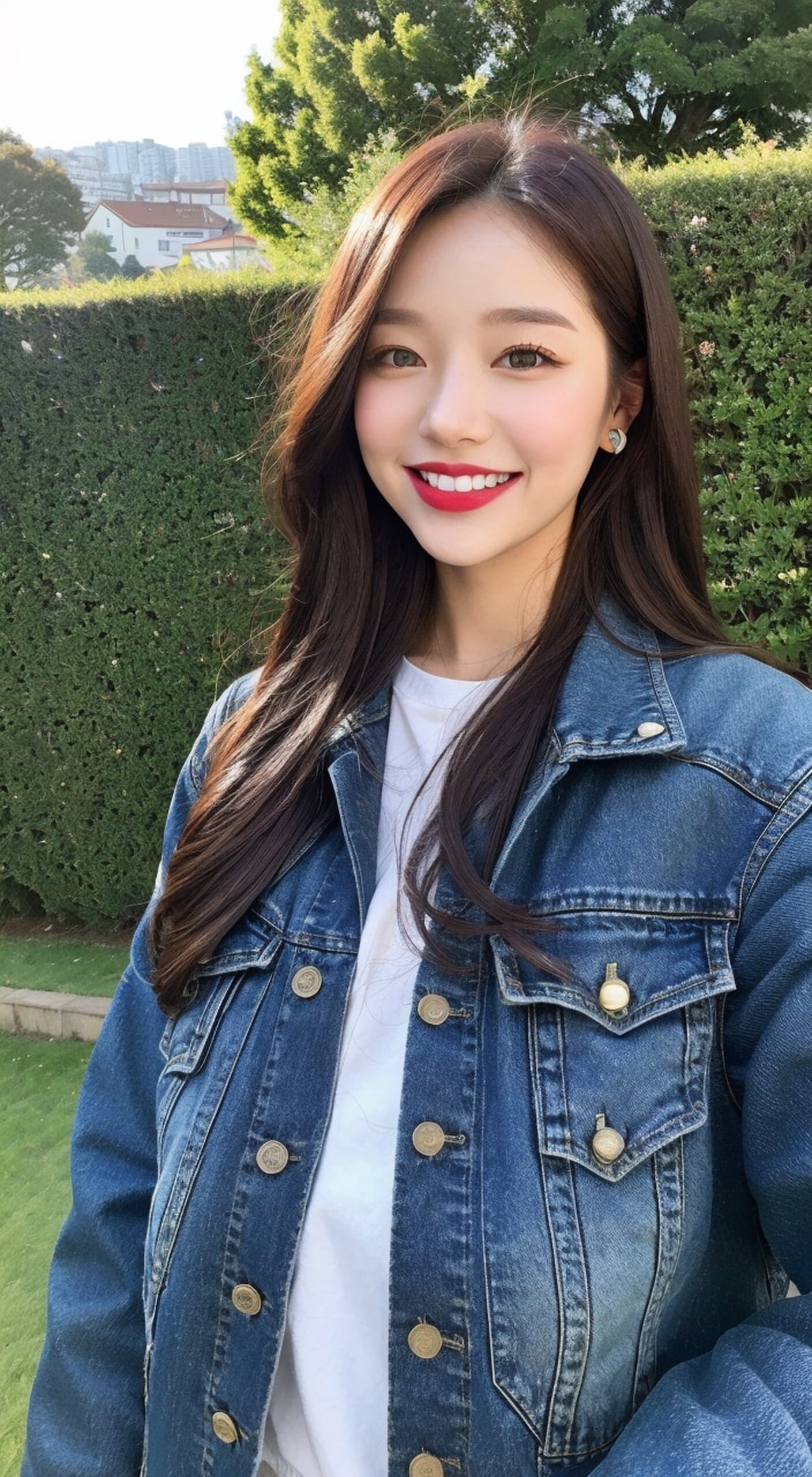 一个二十多岁的女孩,面带笑容,嘴涂口红,身穿羽绒服,蓝色的牛仔裤双手插在口袋里,草地,花园里,蓝蓝的天空。全身照