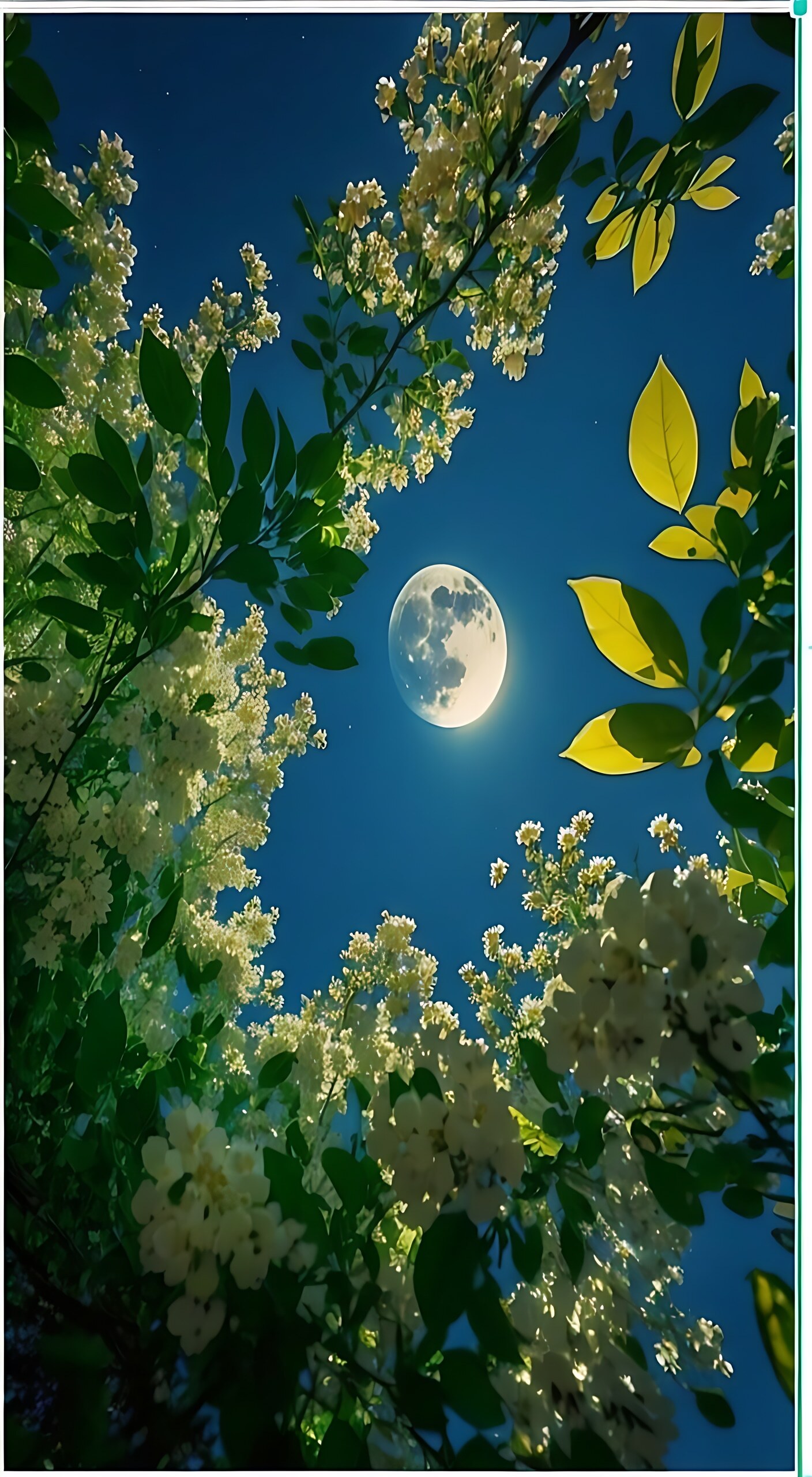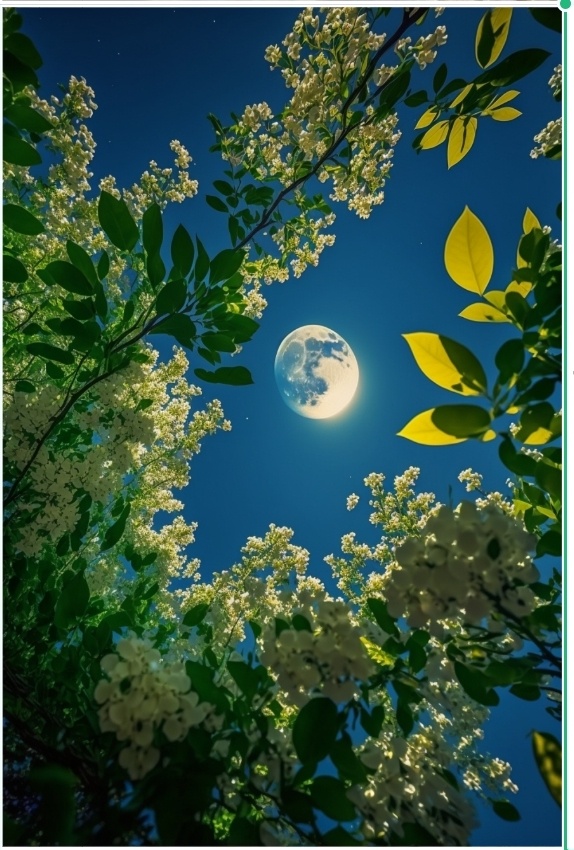looking up from the bottom, you can see the full moon in the blue sky through the dense jasmine flowers congfu and green leaves the flowers are crystal clear,pure and flawless,ultra hd 8k, a dreamy fairy tale, beautiful, romantic,3d,sony camera shooting, ultrahigh definition picture quality,hd, ural, eos 5ds r,4kpicture,cgsociety(点击复制)